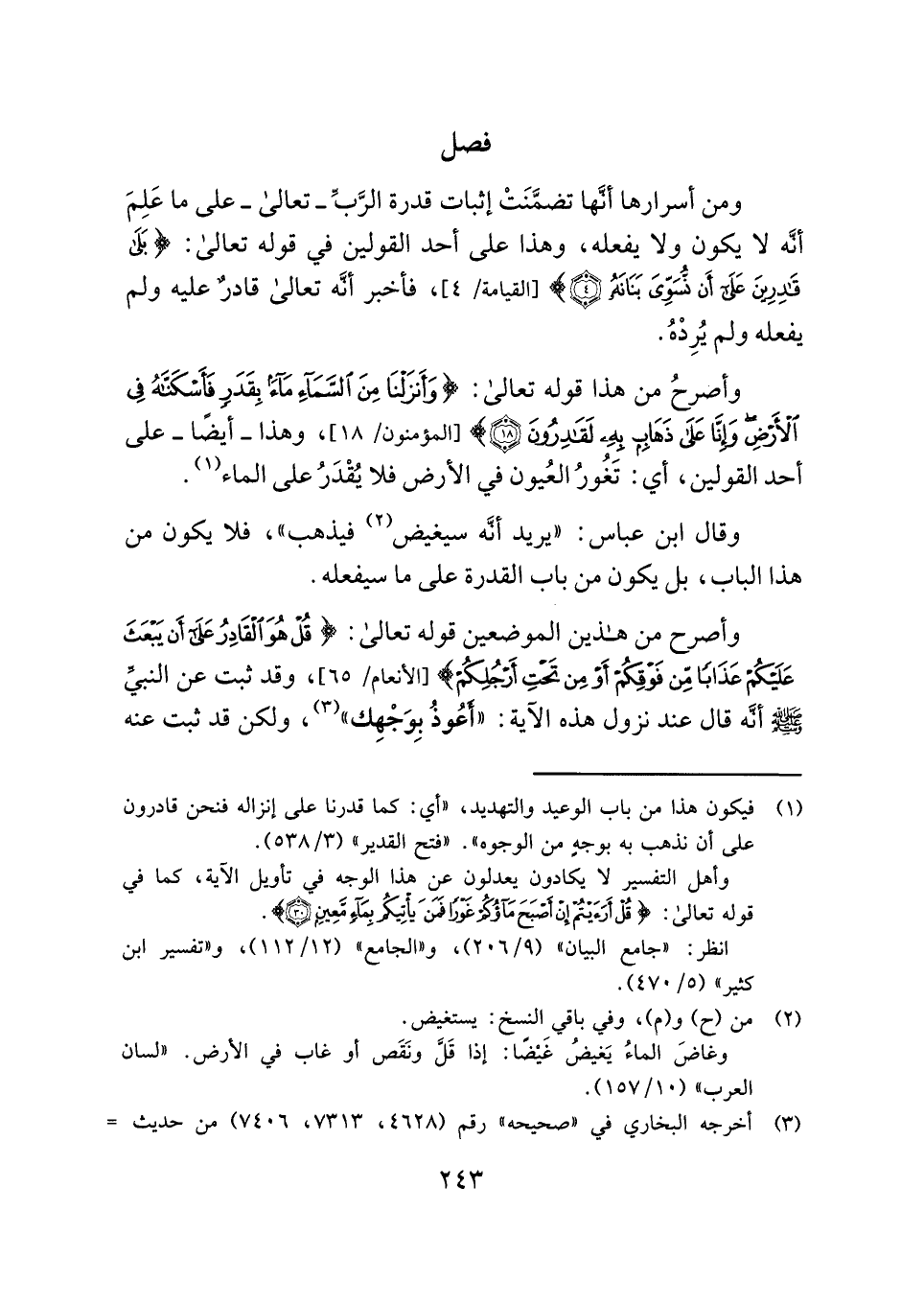 وأصرح من هذين الموضعين قوله تعالى: {قُلْ هُوَ الْقَادِرُ عَلَى أَنْ يَبْعَثَ عَلَيْكُمْ عَذَابًا مِنْ فَوْقِكُمْ أَوْ مِنْ تَحْتِ أَرْجُلِكُمْ} [الأنعام: ٦٥]، وقد ثبت عن النبيِّ - صلى الله عليه وسلم - أنَّه قال عند نزول هذه الآية: "أَعُوذُ بِوَجْهِك" (¬٣)، ولكن قد ثبت عنه
