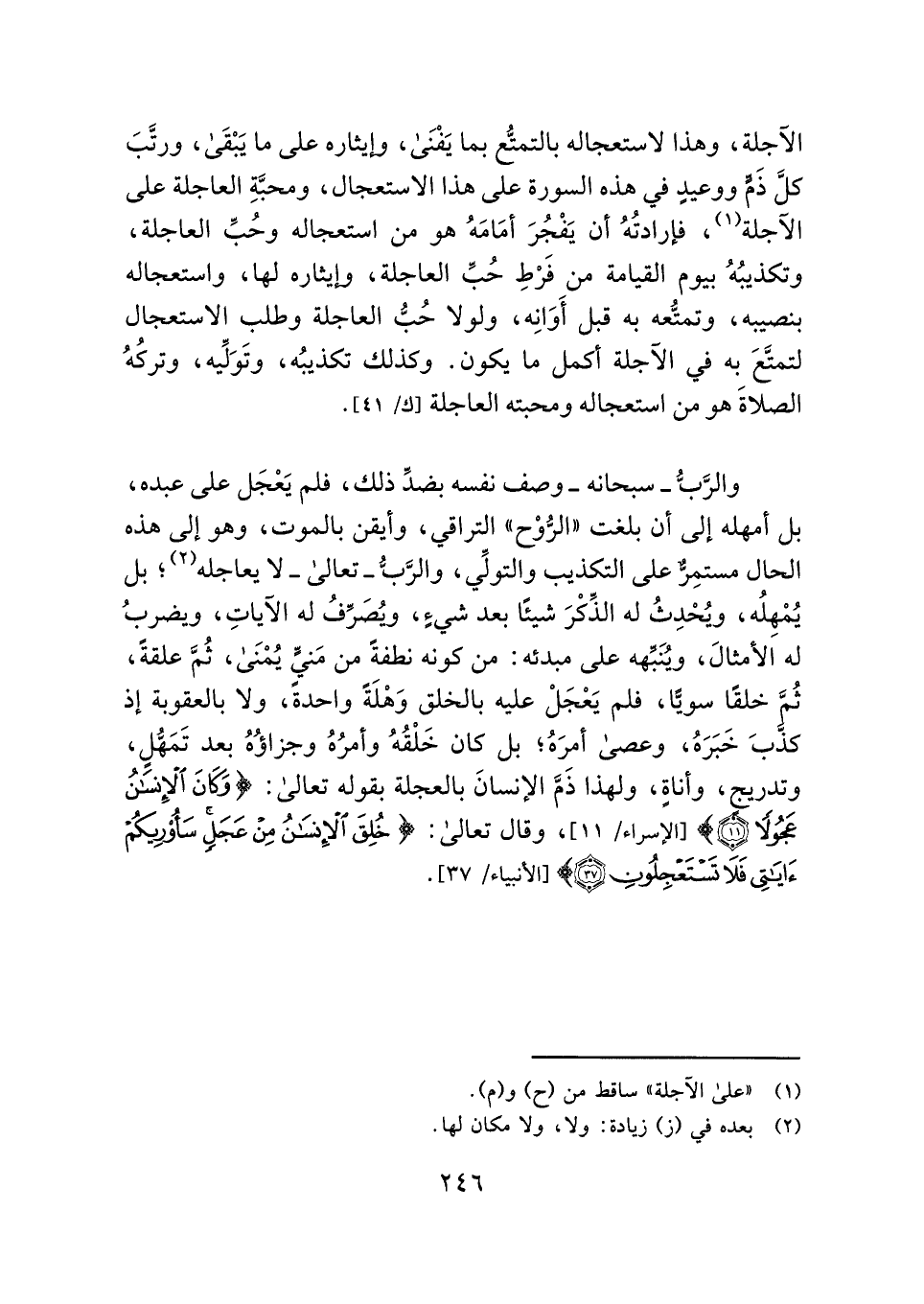 والرَّبُّ - سبحانه - وصف نفسه بضدِّ ذلك، فلم يَعْجَل على عبده، بل أمهله إلى أن بلغت "الرُّوْح" التراقي، وأيقن بالموت، وهو إلى هذه الحال مستمِرٌّ على التكذيب والتولِّي، والرَّبُّ - تعالى - لا يعاجله (¬٢)؛ بل يُمْهِلُه، ويُحْدِثُ له الذِّكْرَ شيئًا بعد شيءٍ، ويُصَرِّفُ له الآياتِ، ويضربُ له الأمثالَ، ويُنَبِّهه على مبدئه: من كونه نطفةً من مَنيٍّ يُمْنَى، ثُمَّ علقةً، ثُمَّ خلقًا سويًّا، فلم يَعْجَلْ عليه بالخلق وَهْلَةً واحدةً، ولا بالعقوبة إذ كذَّبَ خَبَرَهُ، وعصى أمرَهُ؛ بل كان خَلْقُهُ وأمرُهُ وجزاؤُهُ بعد تَمَهُّلٍ، وتدريجٍ، وأناةٍ، ولهذا ذَمَّ الإنسانَ بالعجلة بقوله تعالى: {وَكَانَ الْإِنْسَانُ عَجُولًا (١١)} [الإسراء: ١١]، وقال تعالى: {خُلِقَ الْإِنْسَانُ مِنْ عَجَلٍ سَأُرِيكُمْ آيَاتِي فَلَا تَسْتَعْجِلُونِ (٣٧)} [الأنبياء: ٣٧].