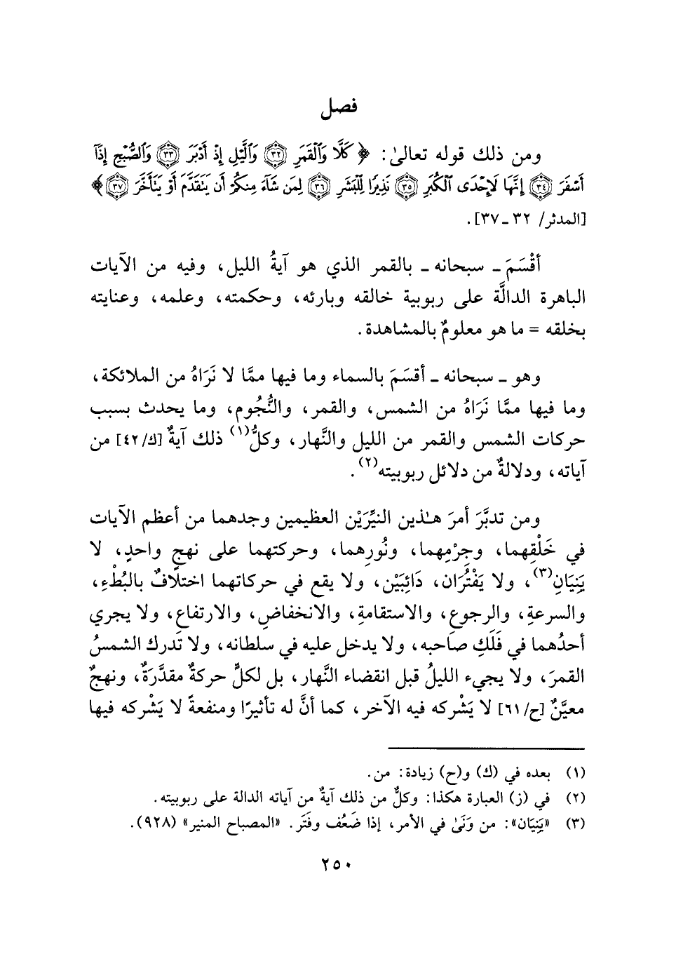 ومن تدبَّرَ أمرَ هذين النيِّرَيْن العظيمين وجدهما من أعظم الآيات في خَلْقِهما، وجِرْمِهما، ونُورِهما، وحركتهما على نهجٍ واحدٍ، لا يَنِيَانِ (¬٣)، ولا يَفْتُرَان، دَائِبَيْن، ولا يقع في حركاتهما اختلافٌ بالبُطْءِ، والسرعةِ، والرجوعِ، والاستقامةِ، والانخفاضِ، والارتفاعِ، ولا يجري أحدُهما في فَلَكِ صَاحبه، ولا يدخل عليه في سلطانه، ولا تدرك الشمسُ القمرَ، ولا يجيء الليلُ قبل انقضاء النَّهار، بل لكلٍّ حركةٌ مقدَّرَةٌ، ونهجٌ معيَّنٌ لا يَشْركه فيه الآخر، كما أنَّ له تأثيرًا ومنفعةً لا يَشْركه فيها