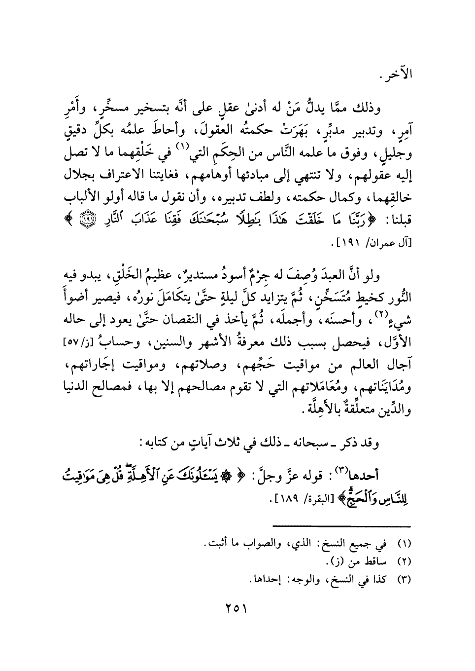 وذلك ممَّا يدلُّ مَنْ له أدنى عقلٍ على أنَّه بتسخير مسخِّرٍ، وأَمْرِ آمِرٍ، وتدبير مدبِّرٍ، بَهَرَتْ حكمتُه العقولَ، وأحاطَ علمُه بكلِّ دقيقٍ وجليلٍ، وفوق ما علمه النَّاس من الحِكَمِ التي (¬١) في خَلْقِهما ما لا تصل إليه عقولهم، ولا تنتهي إلى مبادئها أوهامهم، فغايتنا الاعتراف بجلال خالقِهما، وكمال حكمته، ولطف تدبيره، وأن نقول ما قاله أولو الألباب قبلنا: {رَبَّنَا مَا خَلَقْتَ هَذَا بَاطِلًا سُبْحَانَكَ فَقِنَا عَذَابَ النَّارِ (١٩١)} [آل عمران: ١٩١].