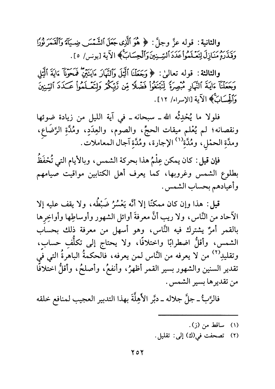 والثانية: قوله - عزَّ وجلَّ -: {هُوَ الَّذِي جَعَلَ الشَّمْسَ ضِيَاءً وَالْقَمَرَ نُورًا وَقَدَّرَهُ مَنَازِلَ لِتَعْلَمُوا عَدَدَ السِّنِينَ وَالْحِسَابَ} الآية [يونس: ٥].