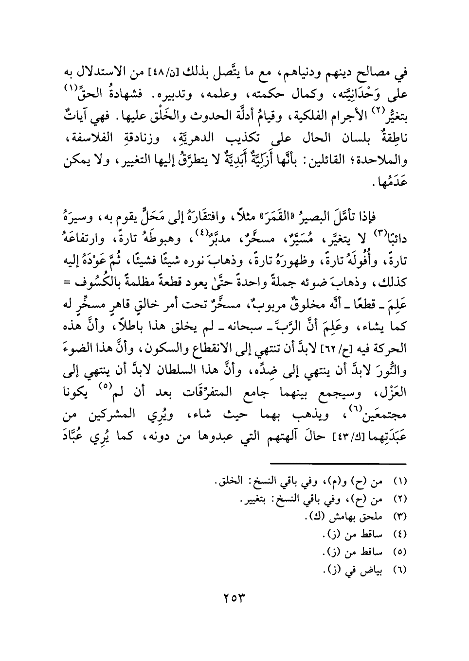 في مصالح دينهم ودنياهم، مع ما يتَّصل بذلك من الاستدلال به على وَحْدَانِيَّته، وكمال حكمته، وعلمه، وتدبيره. فشهادةُ الحقِّ (¬١) بتغيُّر (¬٢) الأجرام الفلكية، وقيامُ أدلَّة الحدوث والخَلْق عليها. فهي آياتٌ ناطِقةٌ بلسان الحال على تكذيب الدهريَّةِ، وزنادقةِ الفلاسفة، والملاحدة؛ القائلين: بأنَّها أَزَلِيَّةٌ أبَدِيَّةٌ لا يتطرَّقُ إليها التغيير، ولا يمكن عَدَمُها.