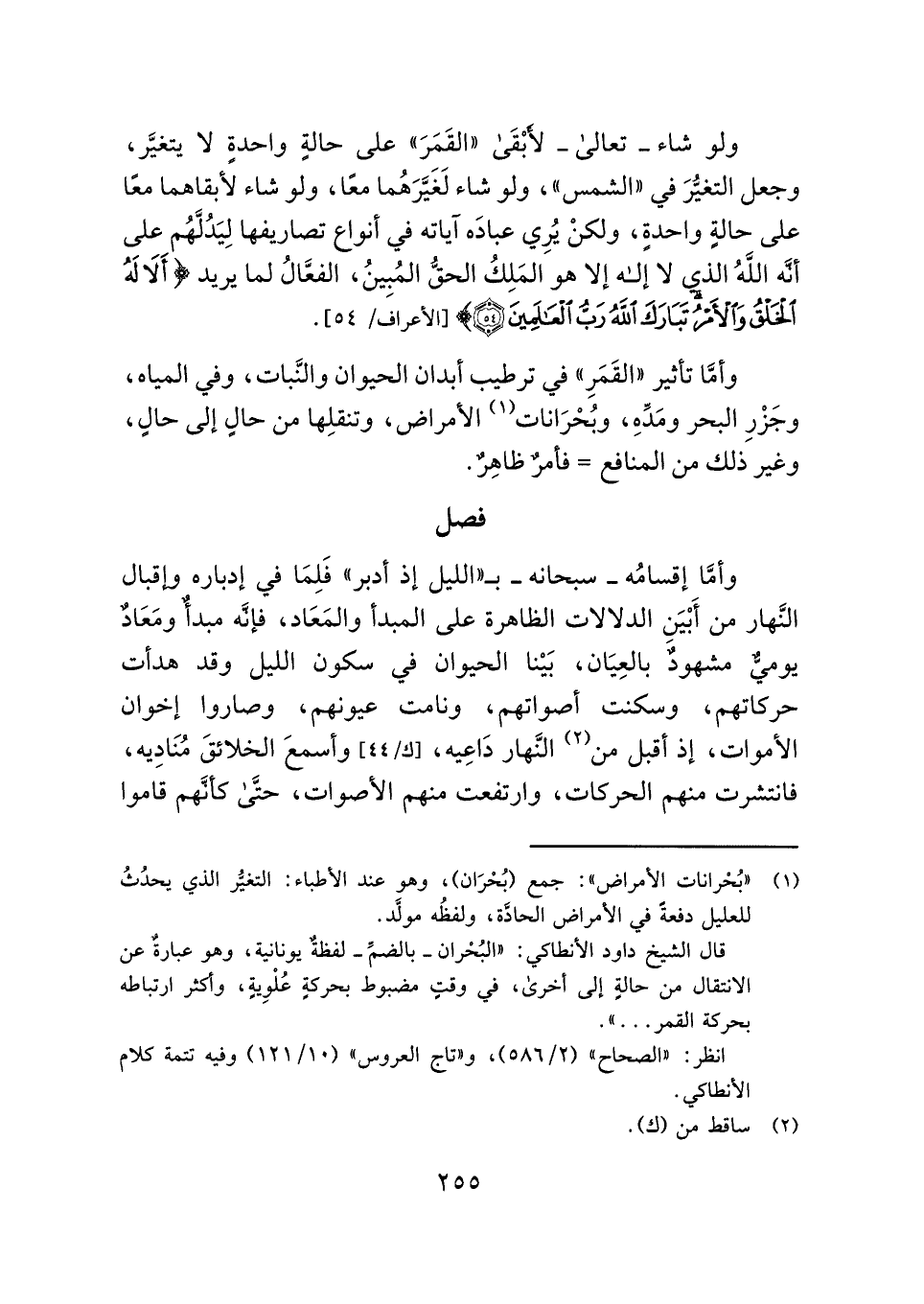 وأمَّا تأثير "القَمَرِ" في ترطيب أبدان الحيوان والنَّبات، وفي المياه، وجَزْرِ البحر ومَدِّهِ، وبُحْرَانات (¬١) الأمراض، وتنقلِها من حالٍ إلى حالٍ، وغير ذلك من المنافع = فأمرٌ ظاهِرٌ.