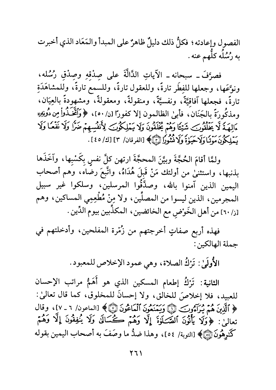 الثانية: تَرْكُ إطعام المسكين الذي هو أَهَمُّ مراتب الإحسان للعبيد، فلا إخلاصَ للخالق، ولا إحسانَ للمخلوق، كما قال تعالى: {الَّذِينَ هُمْ يُرَاءُونَ (٦) وَيَمْنَعُونَ الْمَاعُونَ (٧)} [الماعون: ٦، ٧]، وقال تعالى: {وَلَا يَأْتُونَ الصَّلَاةَ إِلَّا وَهُمْ كُسَالَى وَلَا يُنْفِقُونَ إِلَّا وَهُمْ كَارِهُونَ (٥٤)} [التوبة: ٥٤]، وهذا ضدُّ ما وصَفَ به أصحاب اليمين بقوله