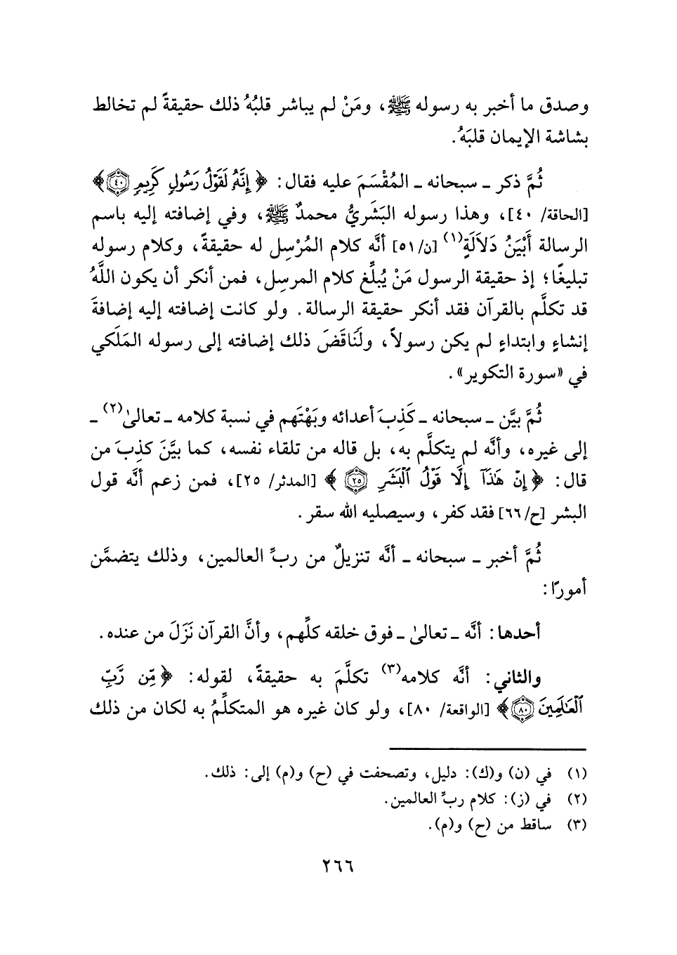 ثُمَّ ذكر - سبحانه - المُقْسَمَ عليه فقال: {إِنَّهُ لَقَوْلُ رَسُولٍ كَرِيمٍ (٤٠)} [الحاقة: ٤٠]، وهذا رسوله البَشَرىُّ محمدٌ - صلى الله عليه وسلم -، وفي إضافته إليه باسم الرسالة أَبْيَنُ دَلَالَةٍ (¬١) أنَّه كلام المُرْسِل له حقيقةً، وكلام رسوله تبليغًا؛ إذ حقيقة الرسول مَنْ يُبلِّغ كلام المرسِل، فمن أنكر أن يكون اللهُ قد تكلَّم بالقرآن فقد أنكر حقيقة الرسالة. ولو كانت إضافته إليه إضافةَ إنشاءٍ وابتداءٍ لم يكن رسولًا، ولَنَاقَضَ ذلك إضافته إلى رسوله المَلَكي في "سورة التكوير".