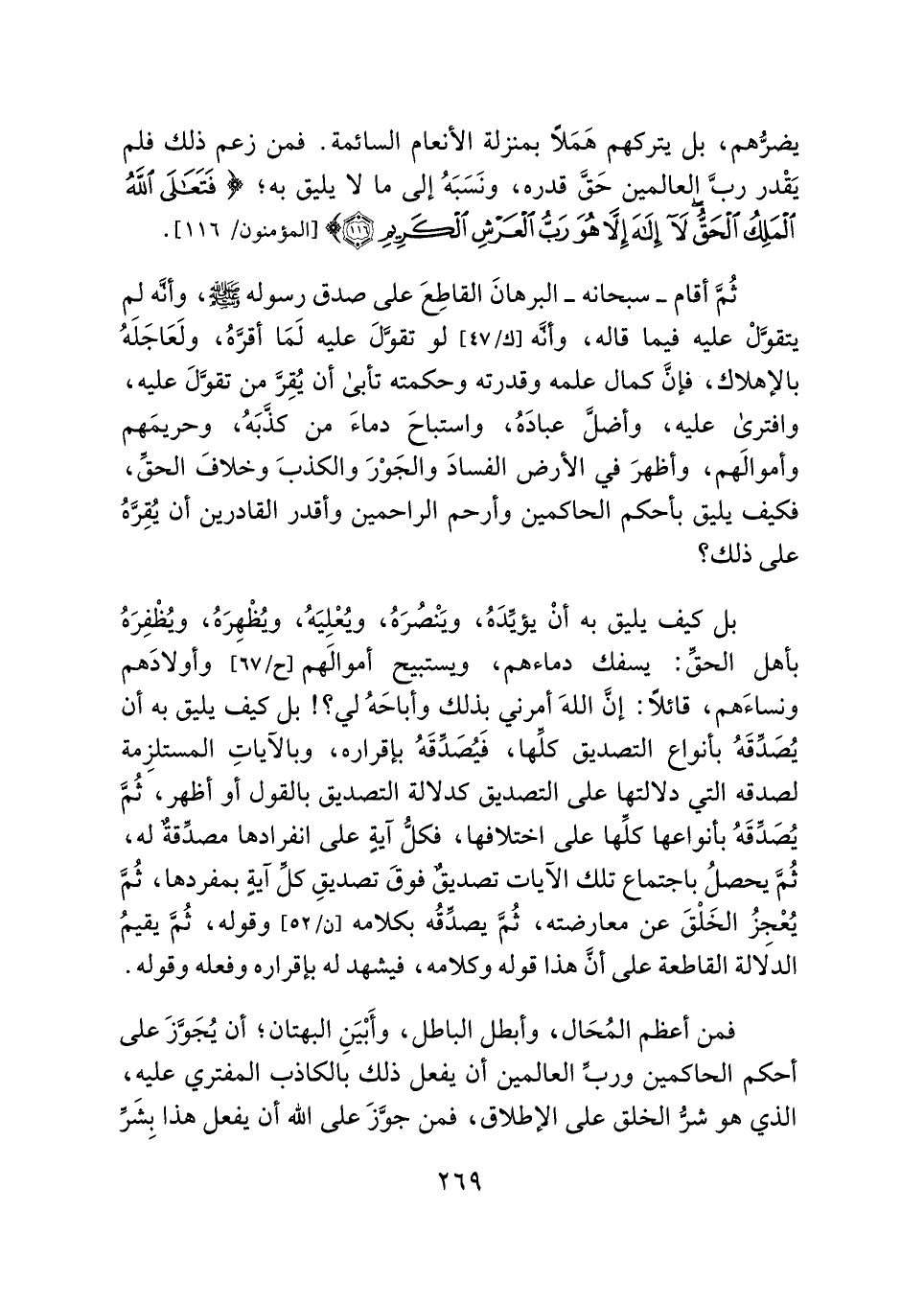 فمن أعظم المُحَال، وأبطل الباطل، وأَبْيَنِ البهتان؛ أن يُجَوَّزَ على أحكم الحاكمين وربِّ العالمين أن يفعل ذلك بالكاذب المفتري عليه، الذي هو شرُّ الخلق على الإطلاق، فمن جوَّزَ على الله أن يفعل هذا بِشَرِّ