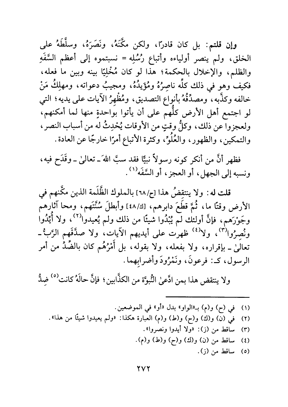 قلت له: ولا ينتقِضُ هذا بالملوك الظَّلَمة الذين مكَّنهم في الأرض وقتًا ما، ثُمَّ قطَعَ دابرهم، وأبطلَ سُنَّتَهم، ومحا آثارهم وجَوْرَهم، فإنَّ أولئك لم يُبْدُوا شيئًا من ذلك ولم يُعيدوا (¬٢) ، ولا أُيِّدُوا ونُصِرُوا (¬٣) ، ولا (¬٤) ظهرت على أيديهم الآيات، ولا صدَّقَهم الرَّبُّ - تعالى - بإقراره، ولا بفعله، ولا بقوله، بل أَمْرُهُم كان بالضدِّ من أمر الرسول، كـ: فرعونَ، ونَمْرُودَ وأضرابِهما.