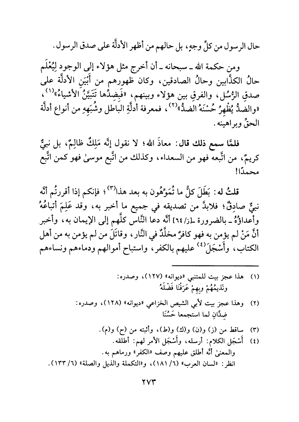 قلتُ له: بَطَلَ كلُّ ما تُمَوِّهُون به بعد هذا (¬٣)؛ فإنكم إذا أقررتُم أنَّه نبيٌّ صادِقٌ؛ فلا بدَّ من تصديقه في جميع ما أخبر به، وقد عَلِمَ أتباعُهُ وأعداؤُهُ - بالضرورة - أنَّه دعا النَّاس كلَّهم إلى الإيمان به، وأخبر أنَّ مَنْ لم يؤمن به فهو كافرٌ مخلَّدٌ في النَّار، وقاتَلَ من لم يؤمن به من أهل الكتاب، وأَسْجَلَ (¬٤) عليهم بالكفر، واستباح أموالهم ودماءهم ونساءهم