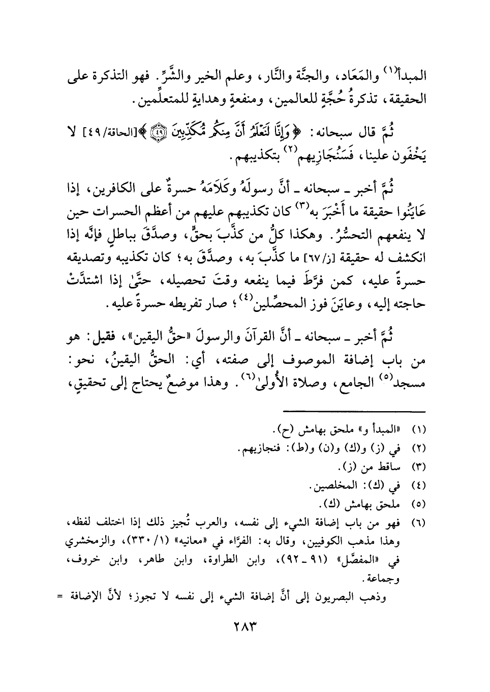 ثُمَّ أخبر - سبحانه - أنَّ القرآنَ والرسولَ "حقُّ اليقين"، فقيل: هو من باب إضافة الموصوف إلى صفته، أي: الحقُّ اليقينُ، نحو: مسجد (¬٥) الجامع، وصلاة الأُولى (¬٦) . وهذا موضعٌ يحتاج إلى تحقيقٍ،