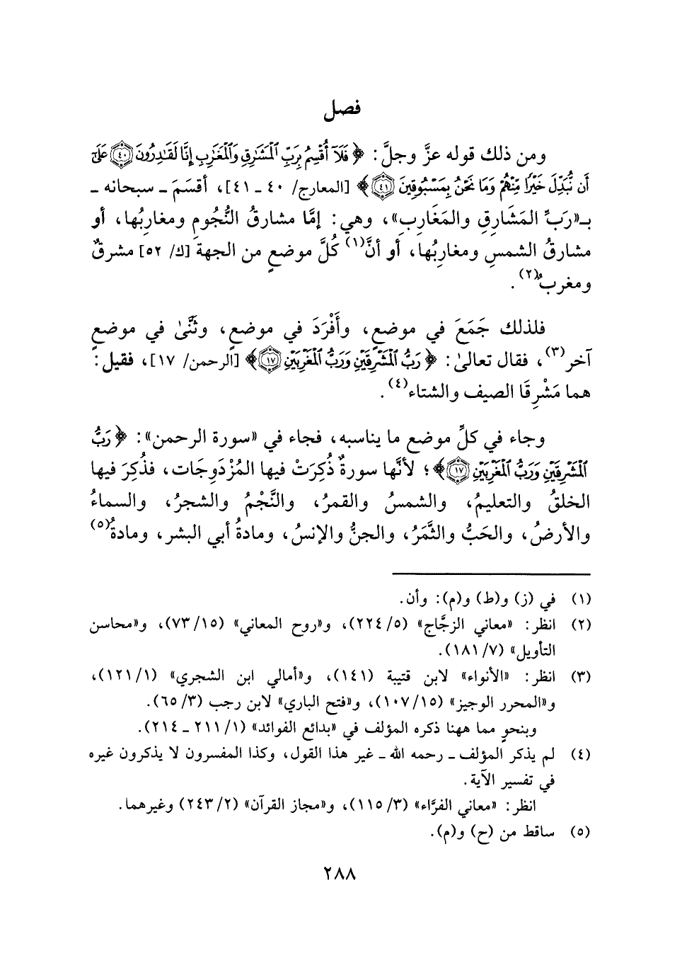 فلذلك جَمَعَ في موضعٍ، وأَفْرَدَ في موضعٍ، وثَنَّى في موضعٍ آخر (¬٣)، فقال تعالى: {رَبُّ الْمَشْرِقَيْنِ وَرَبُّ الْمَغْرِبَيْنِ (١٧)} [الرحمن: ١٧]، فقيل: هما مَشْرِقَا الصيف والشتاء (¬٤).