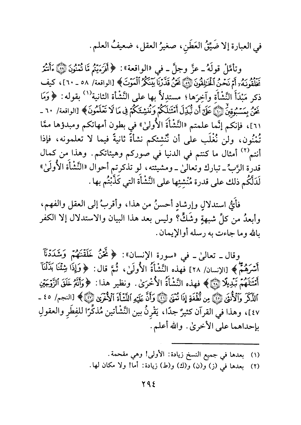 وقال - تعالى - في "سورة الإنسان": {نَحْنُ خَلَقْنَاهُمْ وَشَدَدْنَا أَسْرَهُمْ} [الإنسان: ٢٨] فهذه النَّشْأَةُ الأُولَى، ثُمَّ قال: {وَإِذَا شِئْنَا بَدَّلْنَا أَمْثَالَهُمْ تَبْدِيلًا (٢٨)} فهذه النَّشْأَةُ الأُخْرَى. ونظير هذا: {وَأَنَّهُ خَلَقَ الزَّوْجَيْنِ الذَّكَرَ وَالْأُنْثَى (٤٥) مِنْ نُطْفَةٍ إِذَا تُمْنَى (٤٦) وَأَنَّ عَلَيْهِ النَّشْأَةَ الْأُخْرَى (٤٧)} [النجم: ٤٥ - ٤٧]، وهذا في القرآن كثيرٌ جدًا، يَقْرِنُ بين النَّشْأتين مُذكِّرًا للفِطَرِ والعقولِ بإحداهما على الأخرى. والله أعلم.