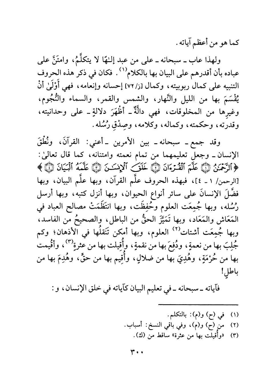 وقد جمع - سبحانه - بين الأمرين - أعني: القرآنَ، ونُطْقَ الإنسان - وجعل تعليمهما من تمام نعمته وامتنانه، كما قال تعالى: {الرَّحْمَنُ (١ ) عَلَّمَ الْقُرْآنَ (٢ ) خَلَقَ الْإِنْسَانَ (٣) عَلَّمَهُ الْبَيَانَ (٤) } [الرحمن: ١ - ٤]، فبهذه الحروف علَّم القرآن، وبها علَّم البيان، وبها فضَّلَ الإنسانَ على سائر أنواع الحيوان، وبها أنزل كتبه، وبها أرسل رُسُله، وبها جُمِعَت العلوم وحُفِظَت، وبها انتَظَمَتْ مصالح العباد في المَعَاش والمَعَاد، وبها تَمَيَّزَ الحقُّ من الباطل، والصحيحُ من الفاسد، وبها جُمِعَت أشتات (¬٢) العلوم، وبها أمكن تَنَقلُها في الأذهان؛ وكم جُلِبَ بها من نعمةٍ، ودُفِعَ بها من نقمةٍ، وأُقِيلت بها من عثرةٍ (¬٣) ، وأُقيمت بها من حُرْمَةٍ، وهُدِيَ بها من ضلالٍ، وأُقِيم بها من حقٍّ، وهُدِمَ بها من باطلٍ!