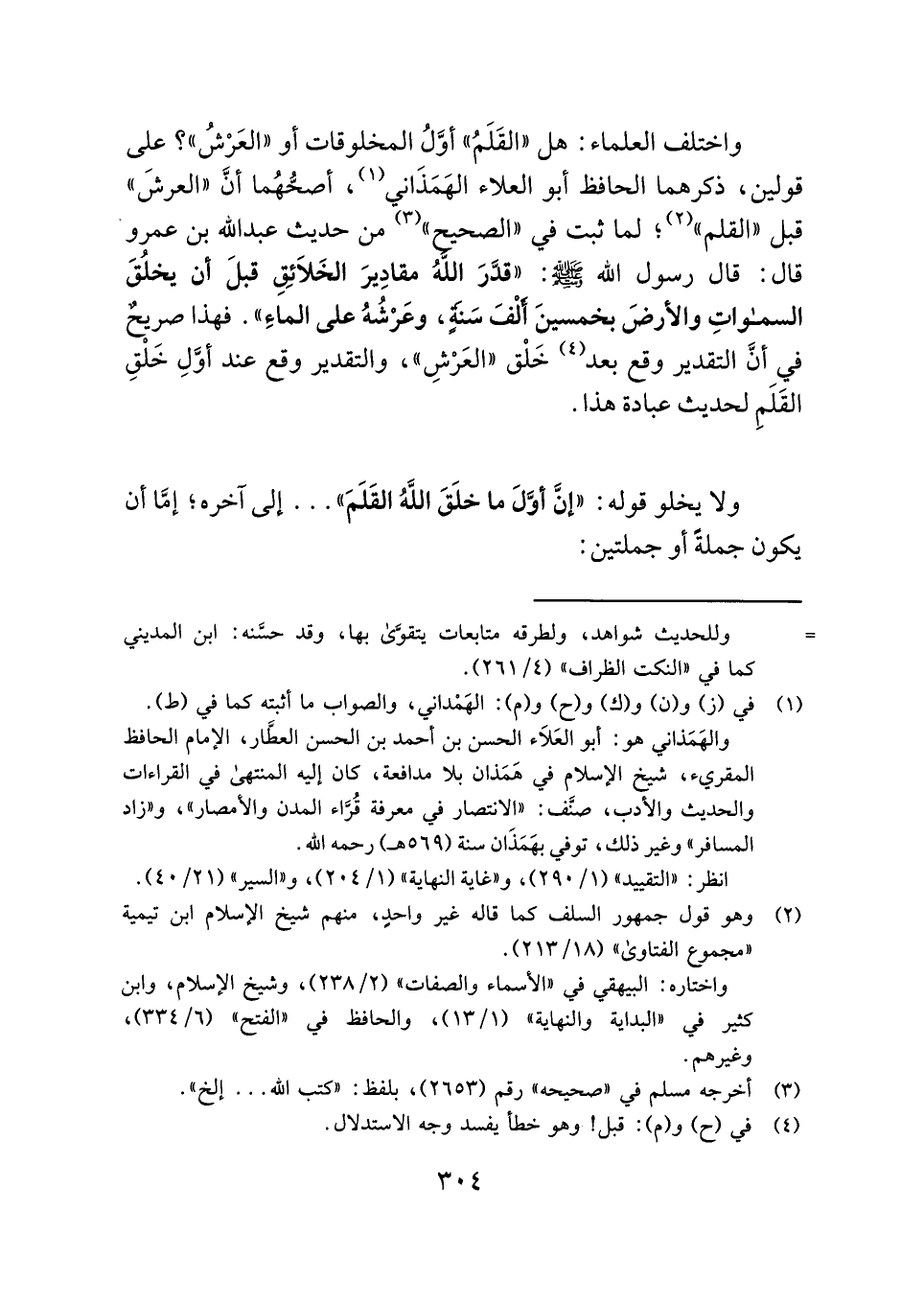 واختلف العلماء: هل "القَلَمُ" أوَّلُ المخلوقات أو "العَرْشُ"؟ على قولين، ذكرهما الحافظ أبو العلاء الهَمَذَاني (¬١)، أصحُّهُما أنَّ "العرشَ" قبل "القلم" (¬٢)؛ لما ثبت في "الصحيح" (¬٣) من حديث عبد الله بن عمرو قال: قال رسول الله - صلى الله عليه وسلم -: "قدَّرَ اللهُ مقادِيرَ الخَلَائِقِ قبلَ أن يخلُقَ السماواتِ والأرضَ بخمسينَ أَلْفَ سَنَةٍ، وعَرْشُهُ على الماءِ". فهذا صريحٌ في أنَّ التقدير وقع بعد (¬٤) خَلْق "العَرْشِ"، والتقدير وقع عند أوَّلِ خَلْقِ القَلَمِ لحديث عبادة هذا.