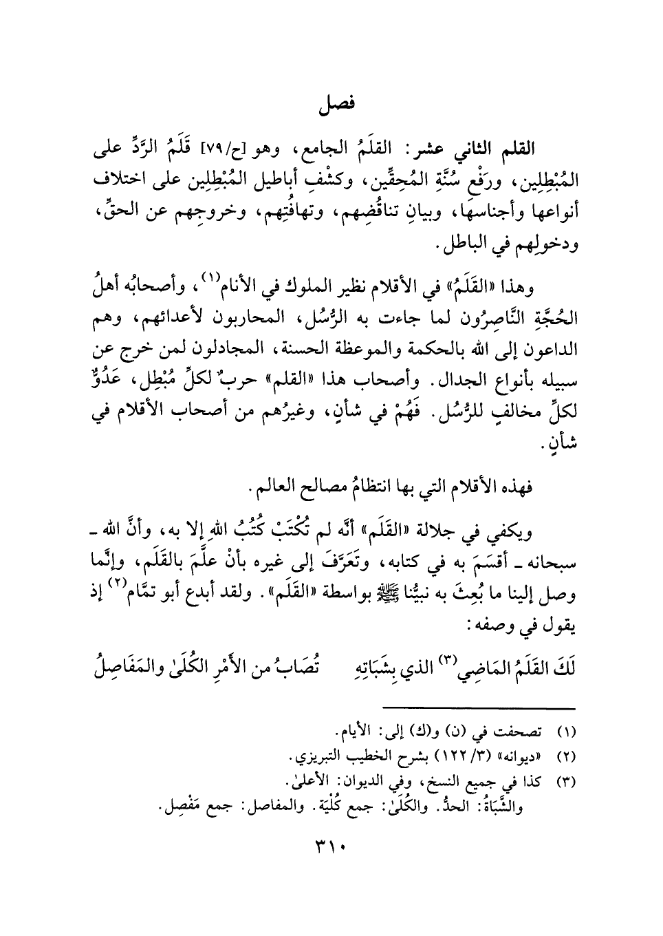 القلم الثاني عشر: القلَمُ الجامع، وهو قَلَمُ الرَّدِّ على المُبْطِلِين، ورَفْعِ سُنَّةِ المُحِقِّين، وكشْفِ أباطيل المُبْطِلِين على اختلاف أنواعها وأجناسها، وبيانِ تناقُضِهم، وتهافُتِهم، وخروجِهم عن الحقِّ، ودخولِهم في الباطل.