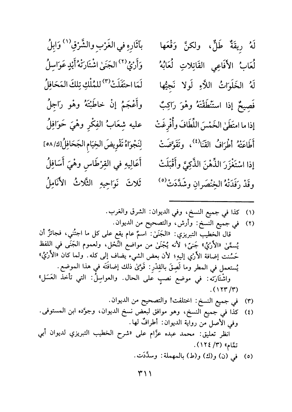 (¬٤) كذا في جميع النسخ، وهو موافق لبعض نسخ الديوان، وجوَّده ابن المستوفى.