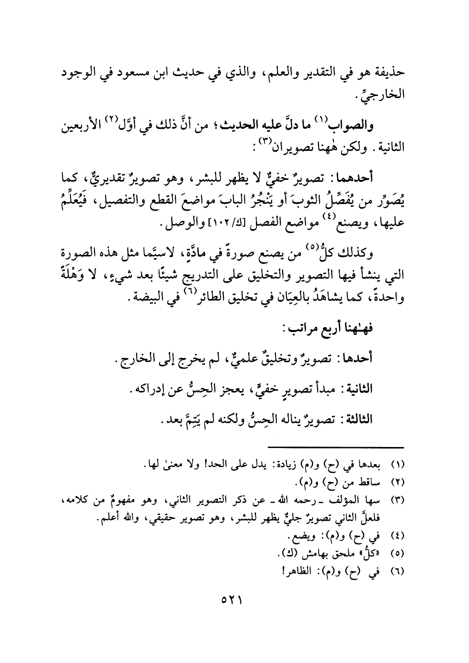 (¬٣) سها المؤلف - رحمه الله - عن ذكر التصوير الثاني، وهو مفهومٌ من كلامه، فلعلَّ الثاني تصويرٌ جليٌّ يظهر للبشر، وهو تصوير حقيقي، والله أعلم.