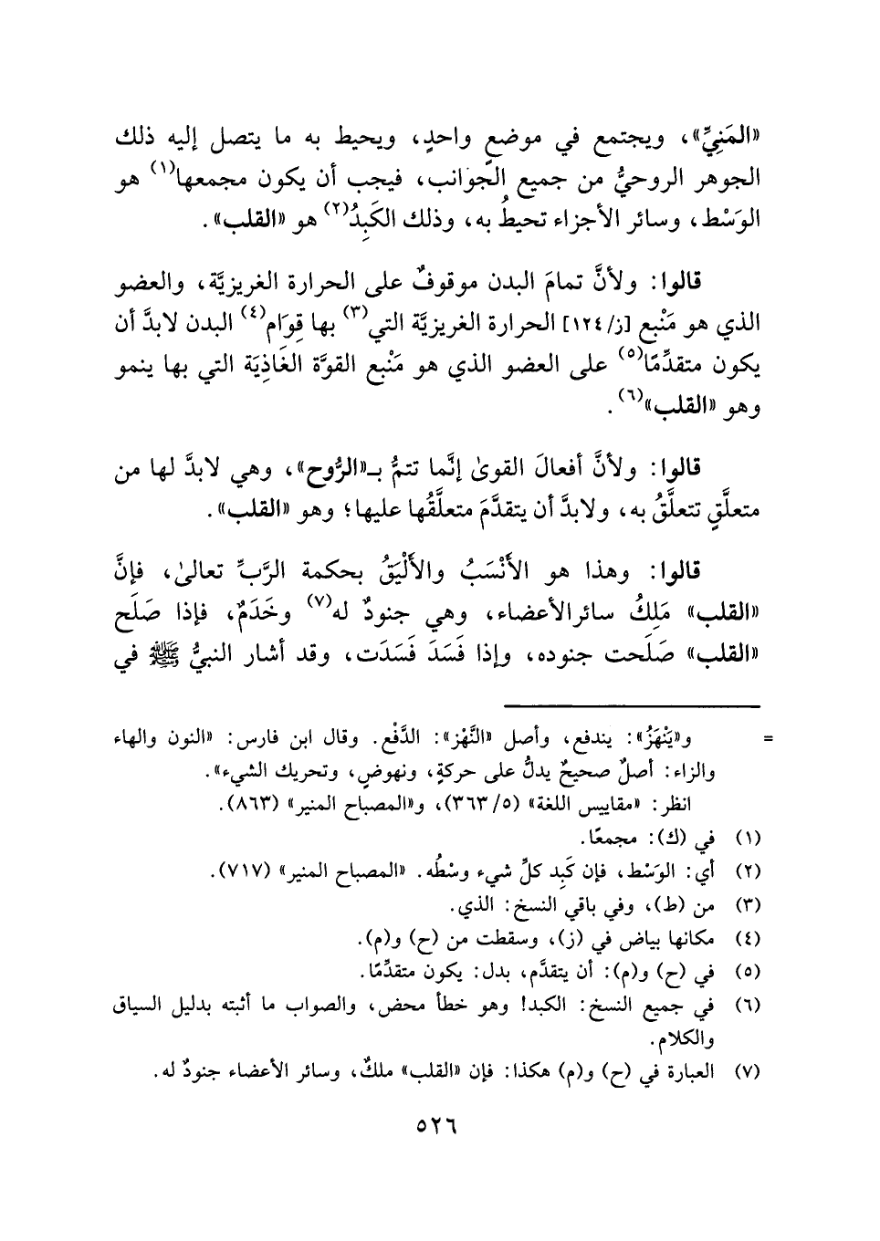 "المَنِيِّ"، ويجتمع في موضعٍ واحدٍ، ويحيط به ما يتصل إليه ذلك الجوهر الروحيُّ من جميع الجوانب، فيجب أن يكون مجمعها (¬١) هو الوَسْط، وسائر الأجزاء تحيطُ به، وذلك الكَبِدُ (¬٢) هو "القلب".