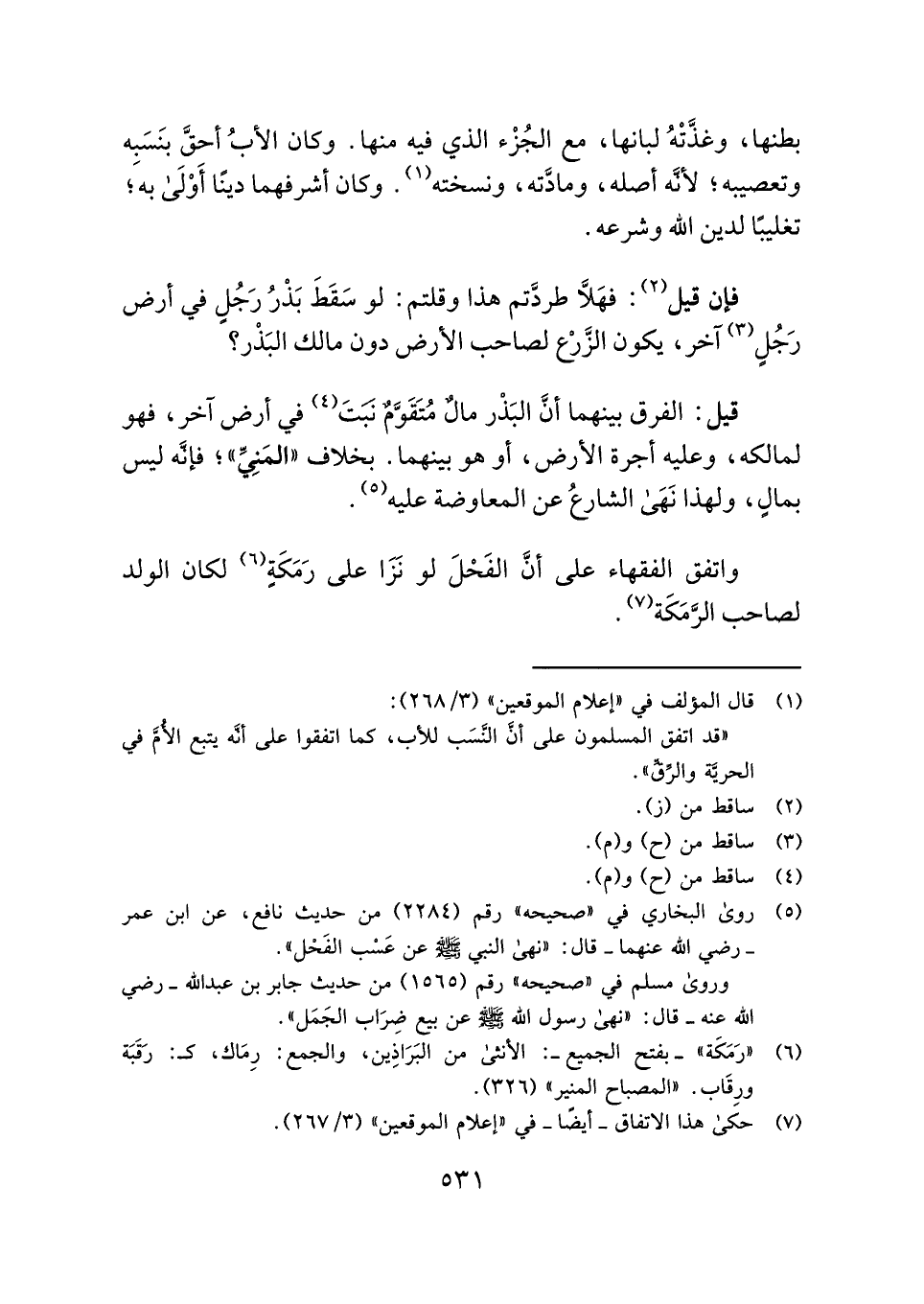قيل: الفرق بينهما أنَّ البَذْر مالٌ مُتَقَوَّمٌ نَبَتَ (¬٤) في أرض آخر، فهو لمالكه، وعليه أجرة الأرض، أو هو بينهما. بخلاف "المَنِيِّ"؛ فإنَّه ليس بمالٍ، ولهذا نَهَى الشارعُ عن المعاوضة عليه (¬٥) .