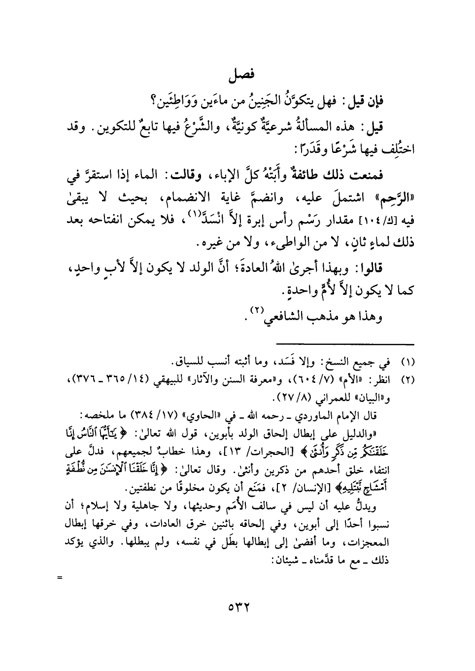 "والدليل على إبطال إلحاق الولد بأبوين، قول الله تعالى: {يَاأَيُّهَا النَّاسُ إِنَّا خَلَقْنَاكُمْ مِنْ ذَكَرٍ وَأُنْثَى} [الحجرات: ١٣]، وهذا خطابٌ لجميعهم، فدلَّ على انتفاء خلق أحدهم من ذكرين وأنثى. وقال تعالى: {إِنَّا خَلَقْنَا الْإِنْسَانَ مِنْ نُطْفَةٍ أَمْشَاجٍ نَبْتَلِيهِ} [الإنسان: ٢]، فمَنَع أن يكون مخلوقًا من نطفتين.