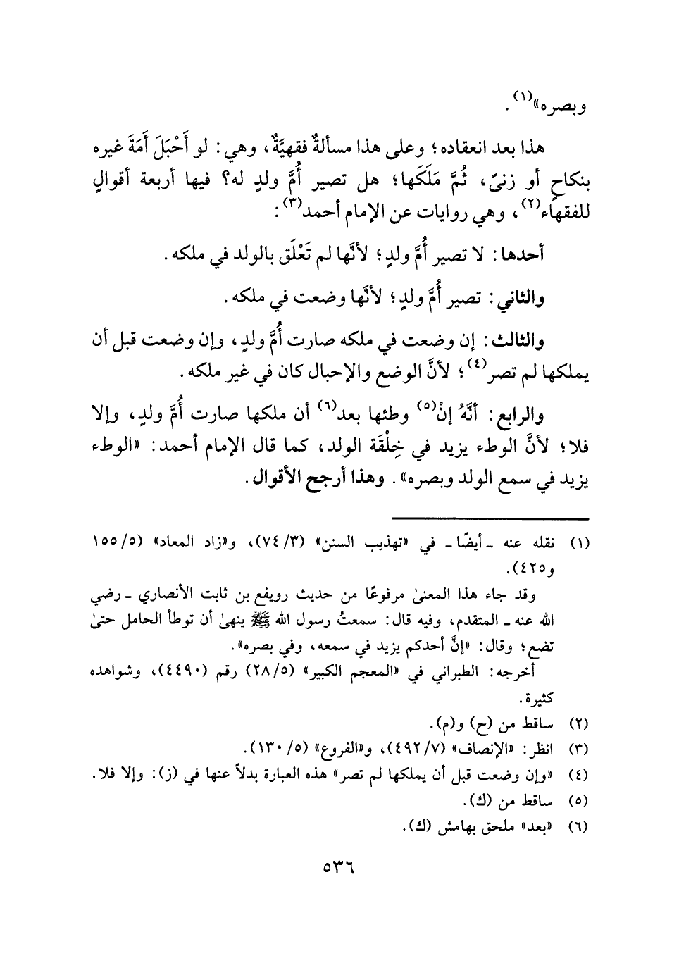 والرابع: أنَّهُ إنْ (¬٥) وطئها بعد (¬٦) أن ملكها صارت أُمَّ ولدٍ، وإلا فلا؛ لأنَّ الوطء يزيد في خِلْقَة الولد، كما قال الإمام أحمد: "الوطء يزيد في سمع الولد وبصره". وهذا أرجح الأقوال.