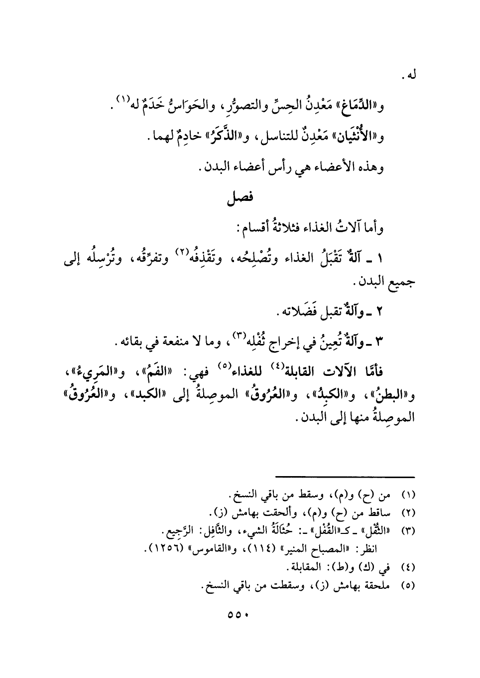 فأمَّا الآلات القابلة (¬٤) للغذاء (¬٥) فهي: "الفَمُ"، و"المَرِيءُ"، و"البطنُ"، و"الكبِدُ"، و"العُرُوقُ" الموصِلةُ إلى "الكبد"، و"العُرُوقُ" الموصِلةُ منها إلى البدن.
