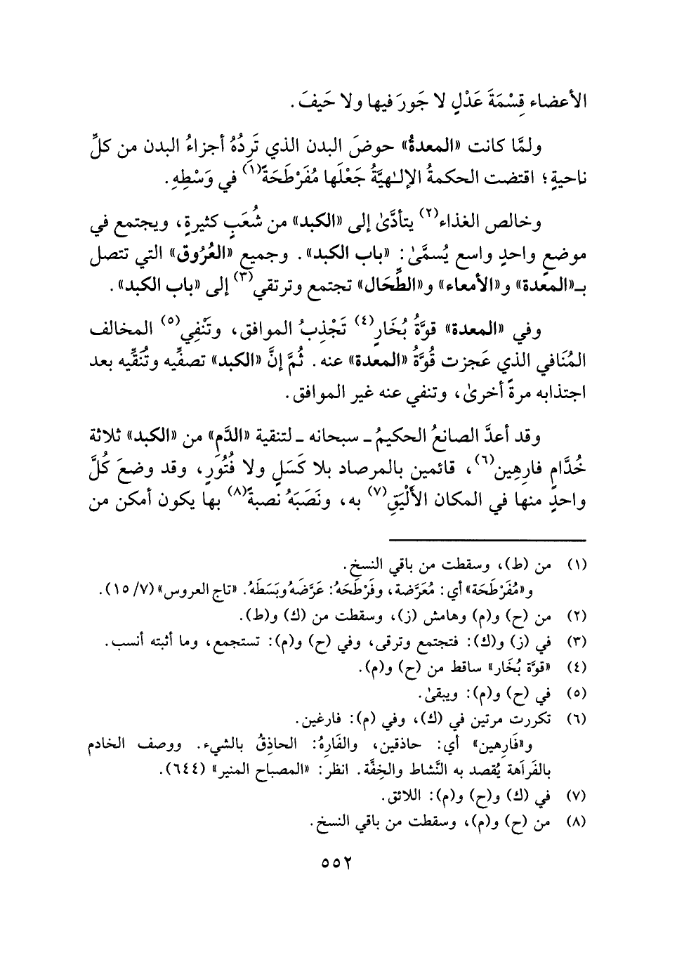 ولمَّا كانت "المعدةُ" حوضَ البدن الذي تَرِدُهُ أجزاءُ البدن من كلِّ ناحيةٍ؛ اقتضت الحكمةُ الإلهيَّةُ جَعْلَها مُفَرْطَحَةً (¬١) في وَسْطِهِ.