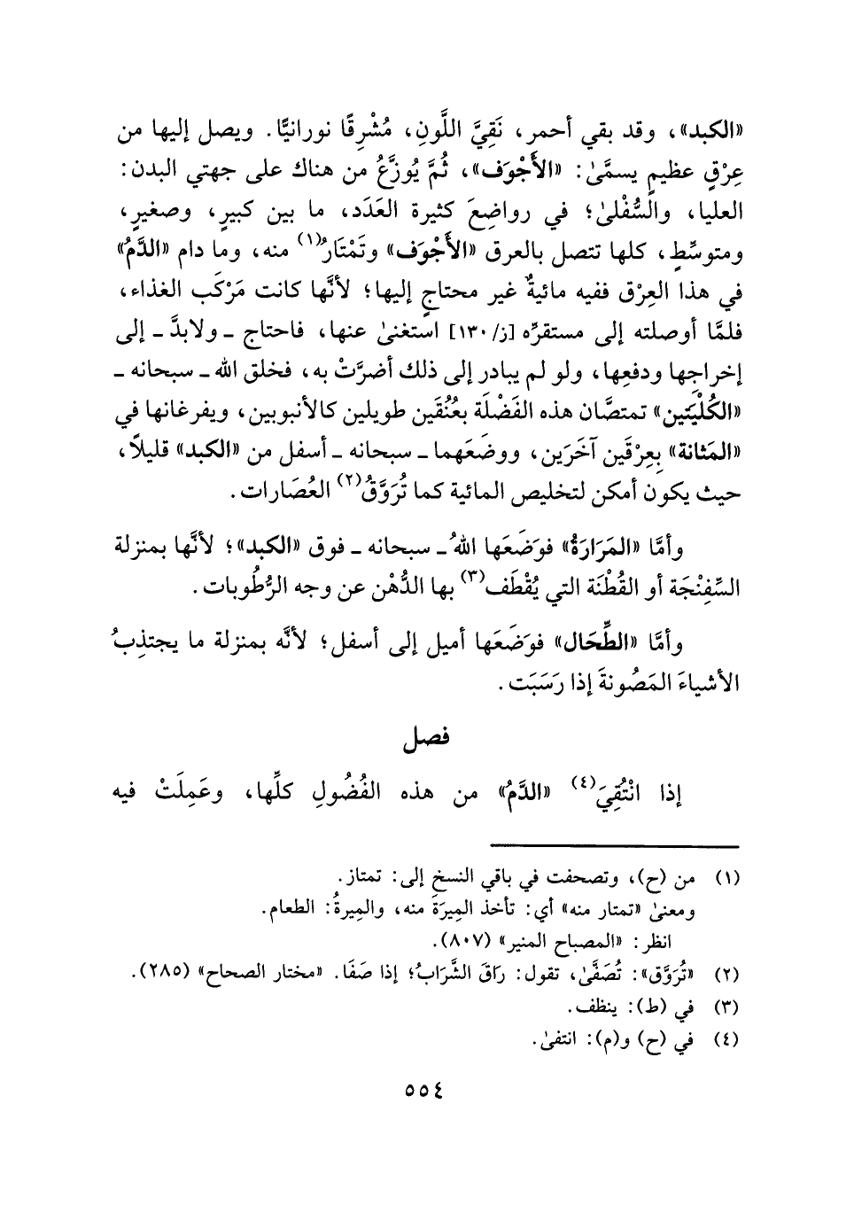 "الكبد"، وقد بقي أحمر، نَقِيَّ اللَّونِ، مُشْرِقًا نورانيًّا. ويصل إليها من عِرْقٍ عظيمٍ يسمَّى: "الأَجْوَف"، ثُمَّ يُوزَّعُ من هناك على جهتي البدن: العليا، والسُّفْلى؛ في رواضِعَ كثيرة العَدَد، ما بين كبيرٍ، وصغيرٍ، ومتوسِّطٍ، كلها تتصل بالعرق "الأَجْوَف" وتَمْتَارُ (¬١) منه، وما دام "الدَّمُ" في هذا العِرْق ففيه مائيةٌ غير محتاجٍ إليها؛ لأنَّها كانت مَرْكَب الغذاء، فلمَّا أوصلته إلى مستقرِّه استغنى عنها، فاحتاج - ولا بدَّ - إلى إخراجِها ودفعِها، ولو لم يبادر إلى ذلك أضرَّتْ به، فخلق الله - سبحانه - "الكُلْيَتين" تمتصَّان هذه الفَضْلَة بعُنُقَين طويلين كالأنبوبين، ويفرغانها في "المَثانة" بِعِرْقَين آخَرَين، ووضَعَهما - سبحانه - أسفل من "الكبد" قليلًا، حيث يكون أمكن لتخليص المائية كما تُرَوَّقُ (¬٢) العُصَارات.