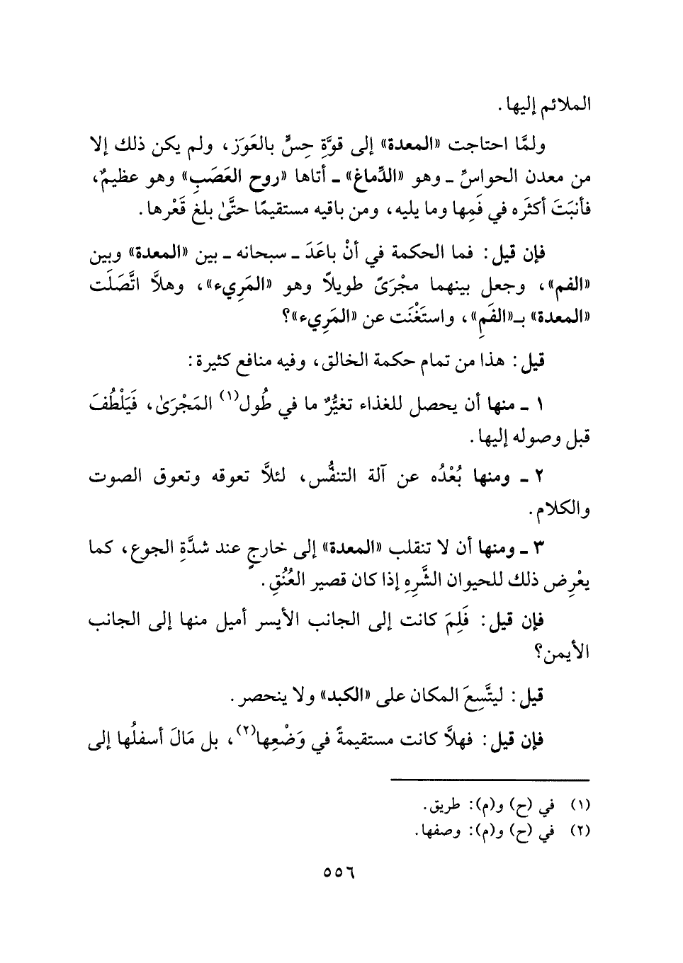 فإن قيل: فما الحكمة في أنْ باعَدَ - سبحانه - بين "المعدة" وبين "الفم"، وجعل بينهما مجْرَىً طويلًا وهو "المَرِيء"، وهلَّا اتَّصَلَت "المعدة" بـ "الفَمِ"، واستَغْنَت عن "المَرِيء"؟