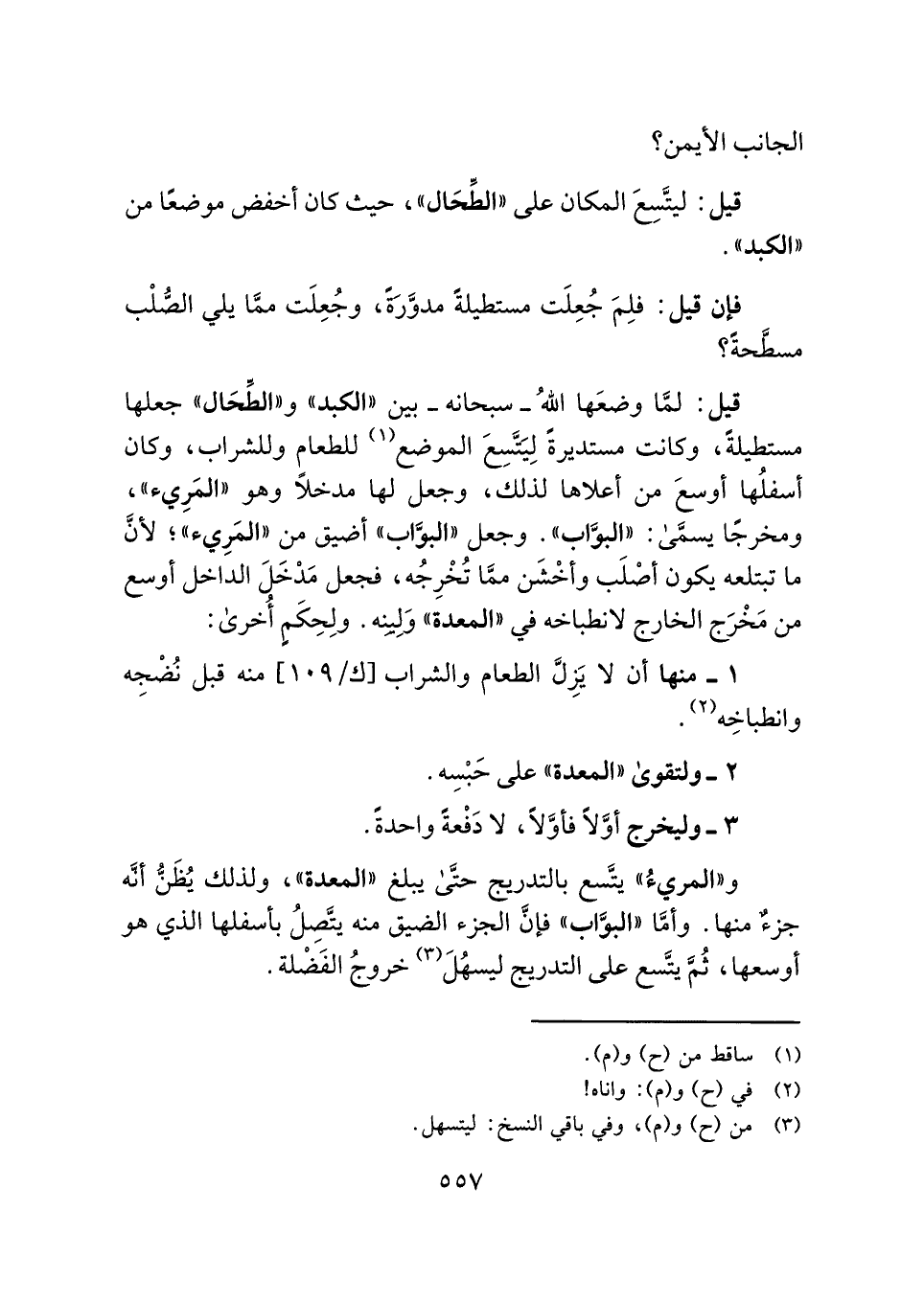 و"المريءُ" يتَّسع بالتدريج حتَّى يبلغ "المعدة"، ولذلك يُظَنُّ أنَّه جزءٌ منها. وأمَّا "البوَّاب" فإنَّ الجزء الضيق منه يتَّصِلُ بأسفلها الذي هو أوسعها، ثُمَّ يتَّسع على التدريج ليسهُلَ (¬٣) خروجُ الفَضْلة.