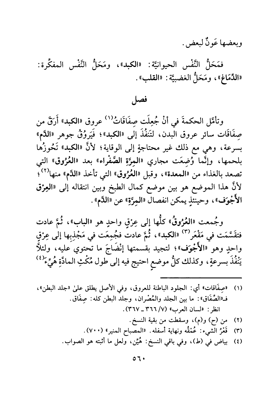 وجُمعت "العُرُوقُ" كلُّها إلى عِرْقٍ واحدٍ هو "الباب"، ثُمَّ عادت فتقَسَّمَت في مَقْعَر (¬٣) "الكبد"، ثُمَّ عادت فجُمِعَت في مَجْذِبِها إلى عِرْقٍ واحدٍ وهو "الأَجْوَف"؛ لتجيد بقسمتها إنْضَاجَ ما تحتوي عليه، ولئلَّا يَنْفُذَ بسرعةٍ، وكذلك كلُّ موضعٍ احتيج فيه إلى طول مُكْثِ المادَّةِ هُيِّءَ (¬٤)
