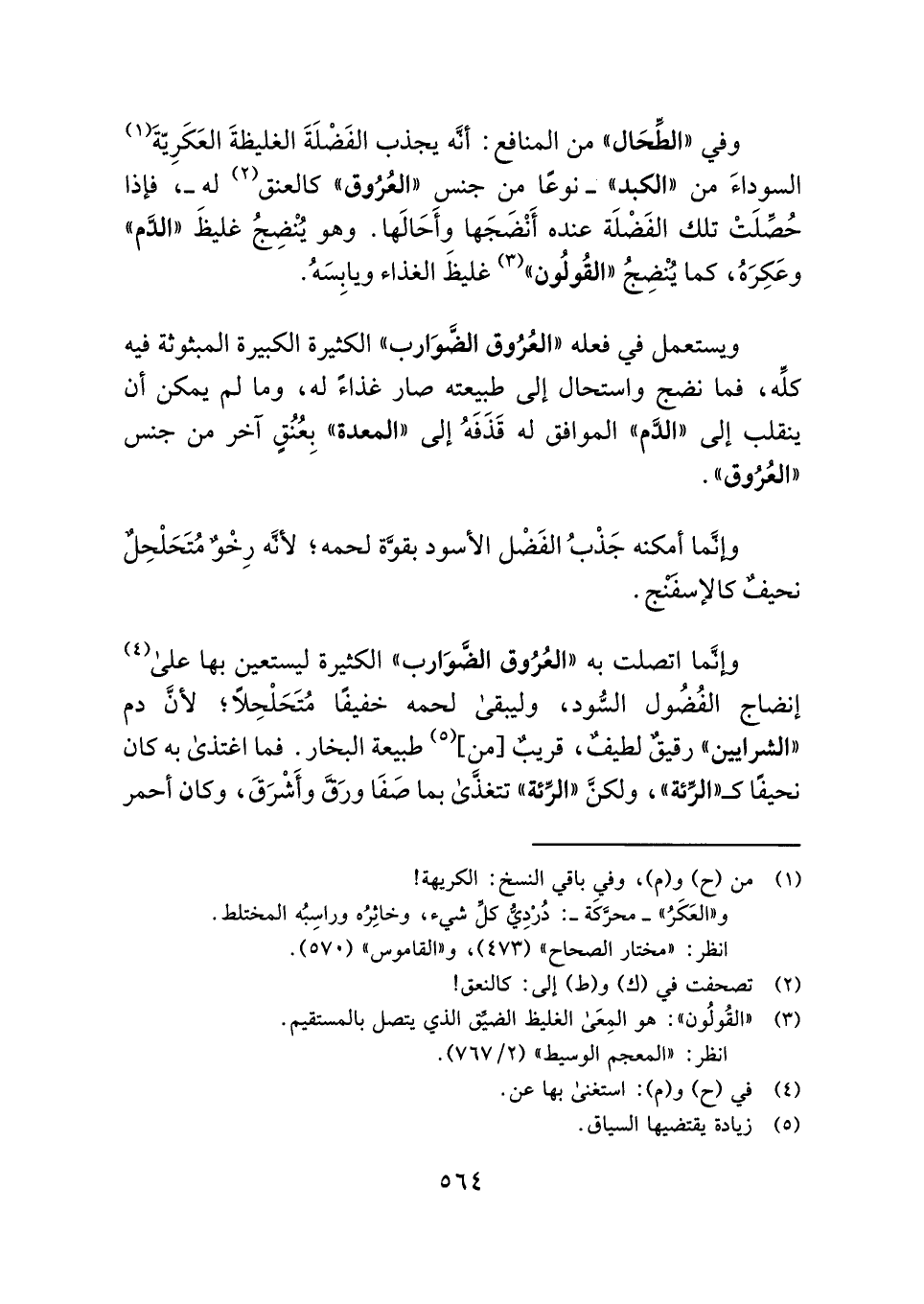 ويستعمل في فعله "العُرُوق الضَّوَارب" الكثيرة الكبيرة المبثوثة فيه كلِّه، فما نضج واستحال إلى طبيعته صار غذاءً له، وما لم يمكن أن ينقلب إلى "الدَّم" الموافق له قَذَفَهُ إلى "المعدة" بِعُنُقٍ آخر من جنس "العُرُوق".