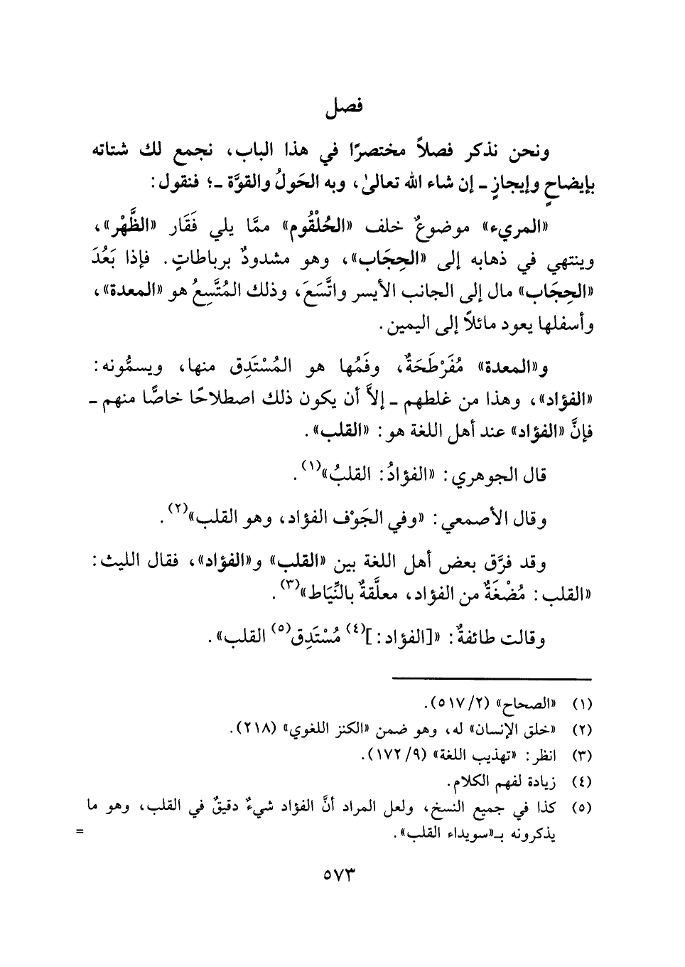 (¬٥) كذا في جميع النسخ، ولعل المراد أنَّ الفؤاد شيءٌ دقيقٌ في القلب، وهو ما يذكرونه بـ "سويداء القلب". =