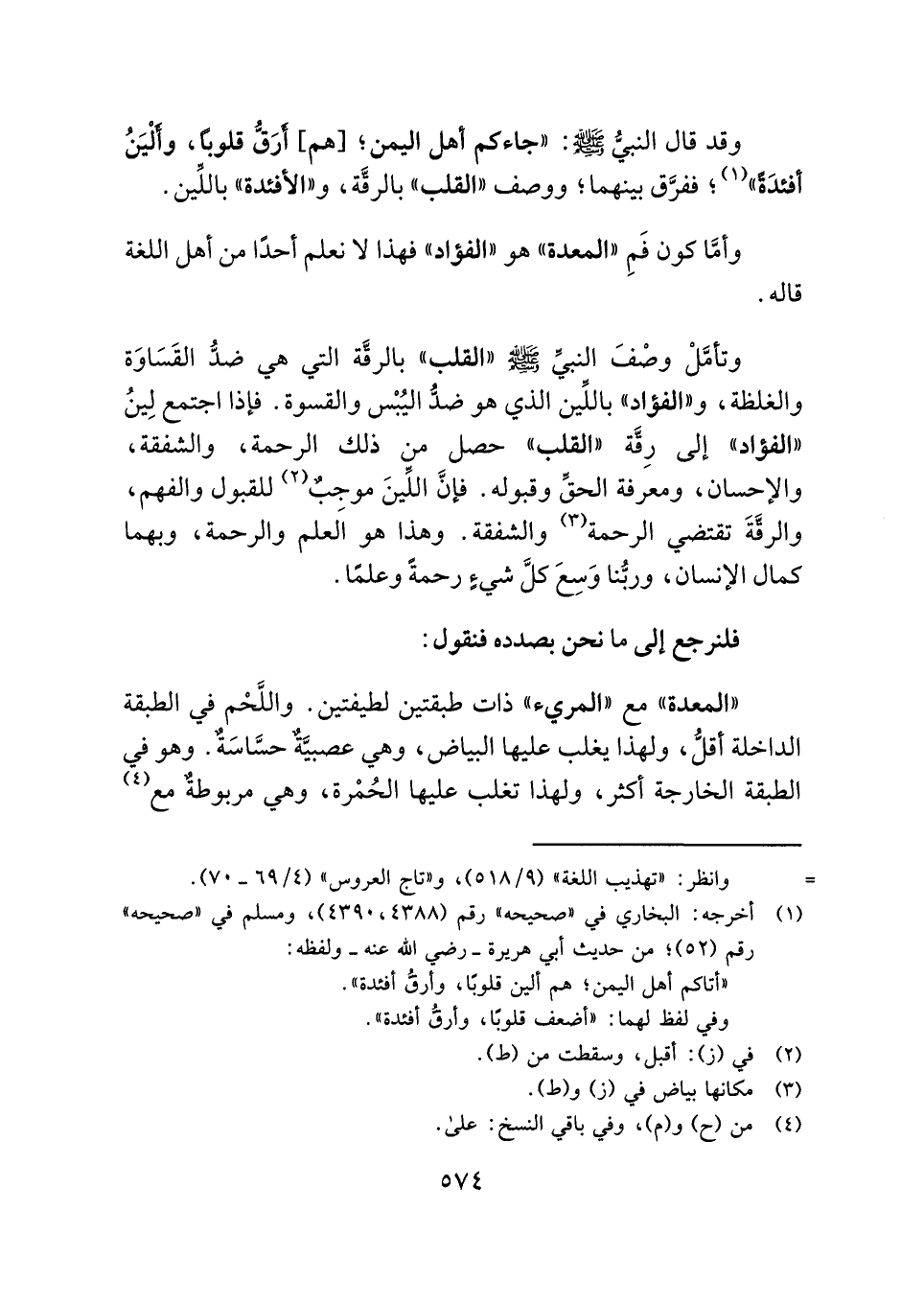 وقد قال النبيُّ - صلى الله عليه وسلم -: "جاءكم أهل اليمن؛ [هم] أَرَقُّ قلوبًا، وأَلْيَنُ أفئدَةً" (¬١) ؛ ففرَّق بينهما؛ ووصف "القلب" بالرقَّة، و"الأفئدة" باللِّين.