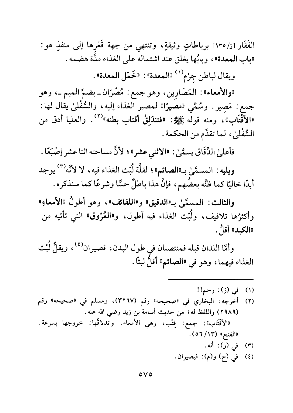 "والأمعاء": المَصَارِين، وهو جمع: مُصْرَان - بضمِّ الميم -، وهو جمع: مَصِير. وسُمِّي "مصيرًا" لمصير الغذاء إليه، والسُّفْلى يقال لها: "الأقْتَاب"، ومنه قوله - صلى الله عليه وسلم -: "فتندَلِقُ أقتاب بطنه" (¬٢) . والعليا أدق من السُّفْلى، لما تقدَّم من الحكمة.