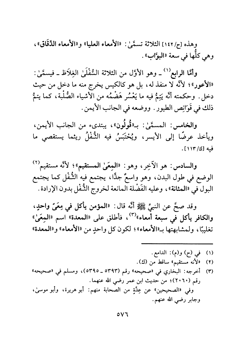 وقد صحَّ عن النبيِّ - صلى الله عليه وسلم- أنَّه قال: "المؤمن يأكل في مِعَىً واحدٍ، والكافر يأكل في سبعة أمعاء" (¬٣) ، فأطلق على "المعدة" اسم "المِعَى" تغليبًا، ولمشابهتها بـ "الأمعاء"؛ لكون كل واحدٍ من "الأمعاء" و"المعدة"