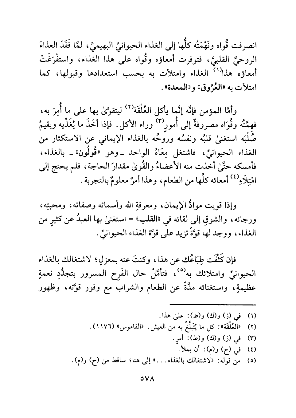 وأمَّا المؤمن فإنَّه إنَّما يأكل العُلْقَة (¬٢) ليتقوَّى بها على ما أُمِرَ به، فهِمَّتُه وقُوَاه مصروفةٌ إلى أُمورٍ (¬٣) وراء الأكل. فإذا أخَذَ ما يُغَذيه ويقيمُ صُلْبَه استغنى قلبُه ونفسُه وروحُه بالغذاء الإيماني عن الاستكثار من الغذاء الحيوانيِّ، فاشتغل مِعَاهُ الواحد - وهو "قُولُون" - بالغذاء، فأمسكه حتَّى أخذت منه الأعضاءُ والقُوى مقدارَ الحاجة، فلم يحتج إلى امْتِلَاءِ (¬٤) أمعائه كلِّها من الطعام، وهذا أمرٌ معلومٌ بالتجربة.