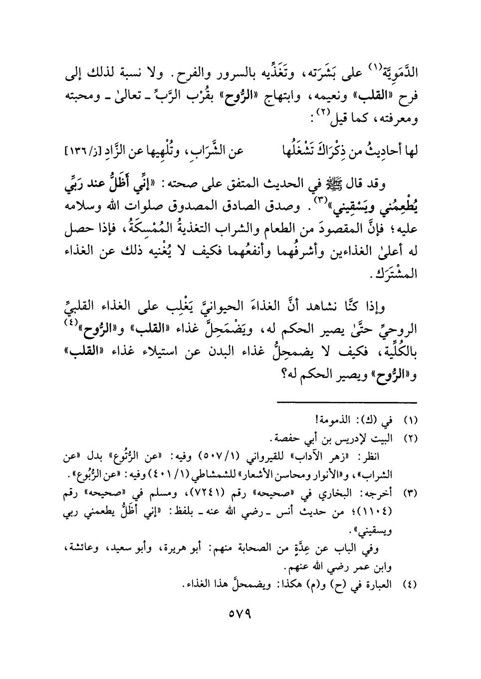 وإذا كنَّا نشاهد أنَّ الغذاءَ الحيوانيَّ يَغْلِب على الغذاء القلبيِّ الروحيِّ حتَّى يصير الحكم له، ويَضْمَحِلَّ غذاء "القلب" و"الرُّوح" (¬٤) بالكُلِّية، فكيف لا يضمحِلُّ غذاء البدن عن استيلاء غذاء "القلب" و"الرُّوح" ويصير الحكم له؟