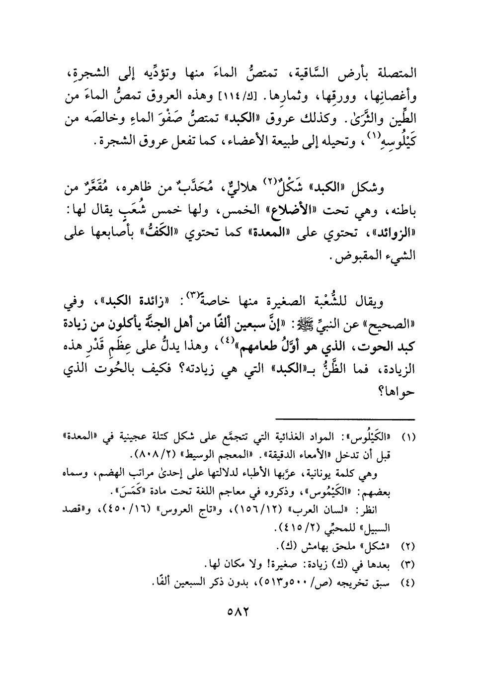 ويقال للشُّعْبة الصغيرة منها خاصةً (¬٣) : "زائدة الكبد"، وفي "الصحيح" عن النبيِّ - صلى الله عليه وسلم -: "إنَّ سبعين ألفًا من أهل الجنَّة يأكلون من زيادة كبد الحوت، الذي هو أوَّلُ طعامهم" (¬٤) ، وهذا يدلُّ على عِظَمِ قَدْرِ هذه الزيادة، فما الظَّنُّ بـ "الكبد" التي هي زيادته؟ فكيف بالحُوت الذي حواها؟