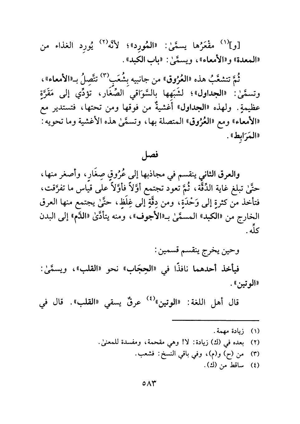 ثُمَّ تتشعَّبُ هذه "العُرُوق" من جانبيه بِشُعَبٍ (¬٣) تتَّصِلُ بـ "الأمعاء"، وتسمَّى: "الجداول"؛ لشَبَهِها بالسَّوَاقي الصِّغَار، تؤدِّي إلى مَقَرَّةٍ عظيمةٍ. ولهذه "الجداول" أَغشيةٌ من فوقها ومن تحتها، فتستدير مع "الأمعاء" ومع "العُرُوق" المتصلة بها، وتسمَّى هذه الأغشية وما تحويه: "المَرَابِط".