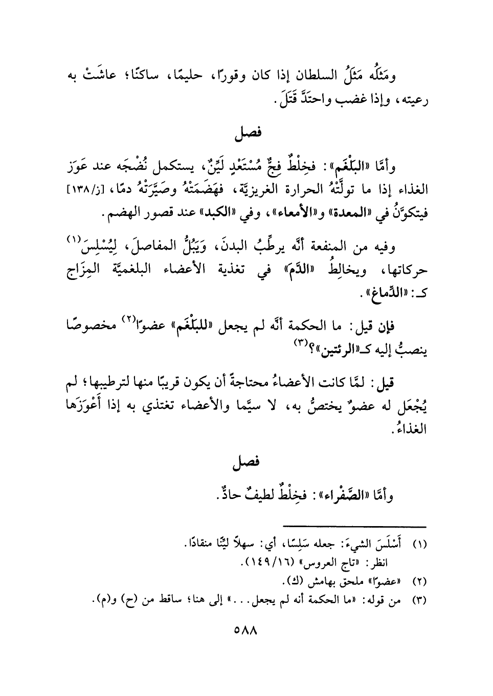 وفيه من المنفعة أنَّه يرطِّبُ البدنَ، وَيَبُلُّ المفاصلَ، لِيُسْلِسَ (¬١) حركاتها، ويخالِطُ "الدَّم" في تغذية الأعضاء البلغميَّة المِزَاج كـ: "الدِّماغ".