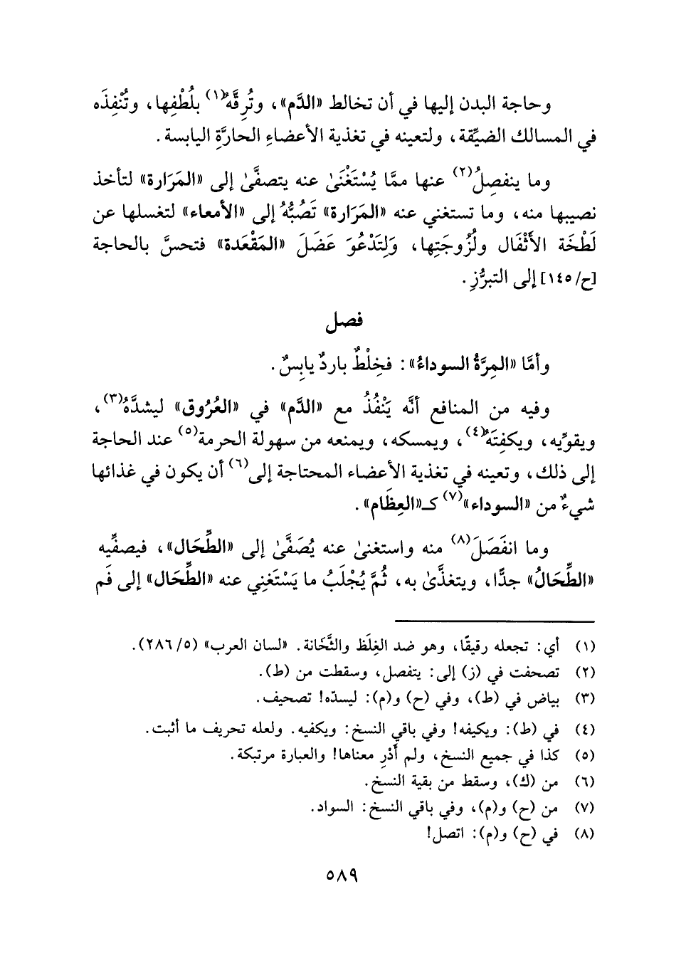 وما انفَصَلَ (¬٨) منه واستغنى عنه يُصَفَّى إلى "الطِّحَال"، فيصفِّيه "الطِّحَالُ" جدًّا، ويتغذَّى به، ثُمَّ يُجْلَبُ ما يَسْتَغنِي عنه "الطِّحَال" إلى فَم