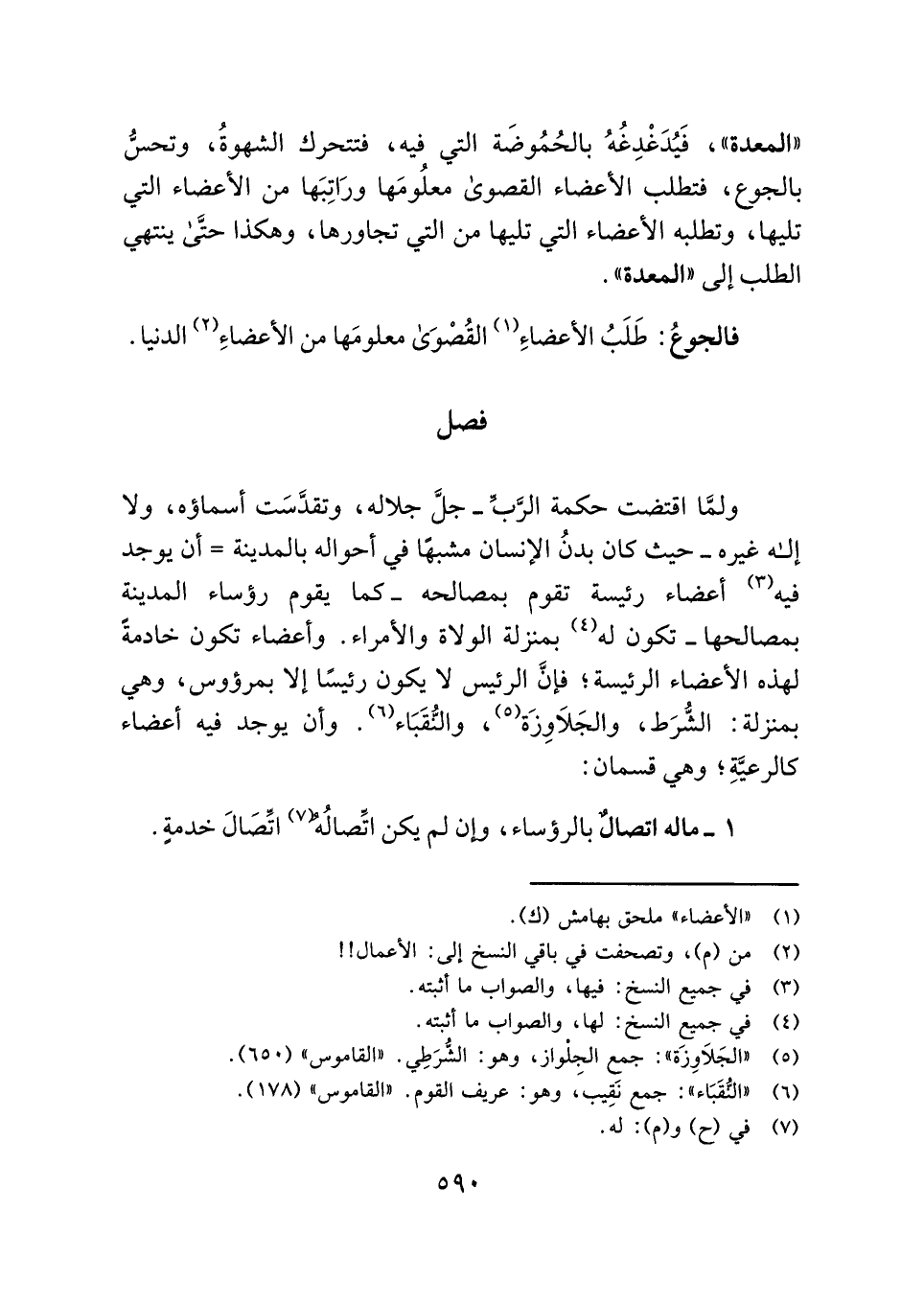 ولمَّا اقتضت حكمة الرَّبِّ - جلَّ جلاله، وتقدَّسَت أسماؤه، ولا إله غيره - حيث كان بدنُ الإنسان مشبهًا في أحواله بالمدينة = أن يوجد فيه (¬٣) أعضاء رئيسة تقوم بمصالحه - كما يقوم رؤساء المدينة بمصالحها - تكون له (¬٤) بمنزلة الولاة والأمراء. وأعضاء تكون خادمةً لهذه الأعضاء الرئيسة؛ فإنَّ الرئيس لا يكون رئيسًا إلا بمرؤوس، وهي بمنزلة: الشُّرَط، والجَلَاوِزَة (¬٥)، والنُّقَبَاء (¬٦). وأن يوجد فيه أعضاء كالرعيَّةِ؛ وهي قسمان: