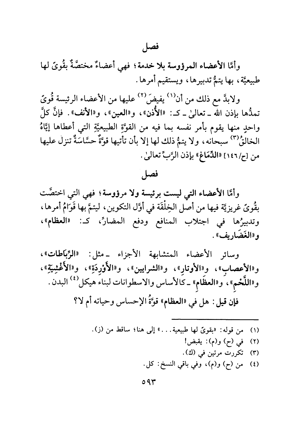 وأمَّا الأعضاء التي ليست برئيسة ولا مرؤوسة؛ فهي التي اختصَّت بقُوىً غريزيَّة فيها من أصل الخِلْقَة في أوَّل التكوين، ليتمَّ بها قَوَامُ أمرها، وتدبيرُها في اجتلاب المنافع ودفع المضارِّ، كـ: "العظام"، و"الغَضَاريف".