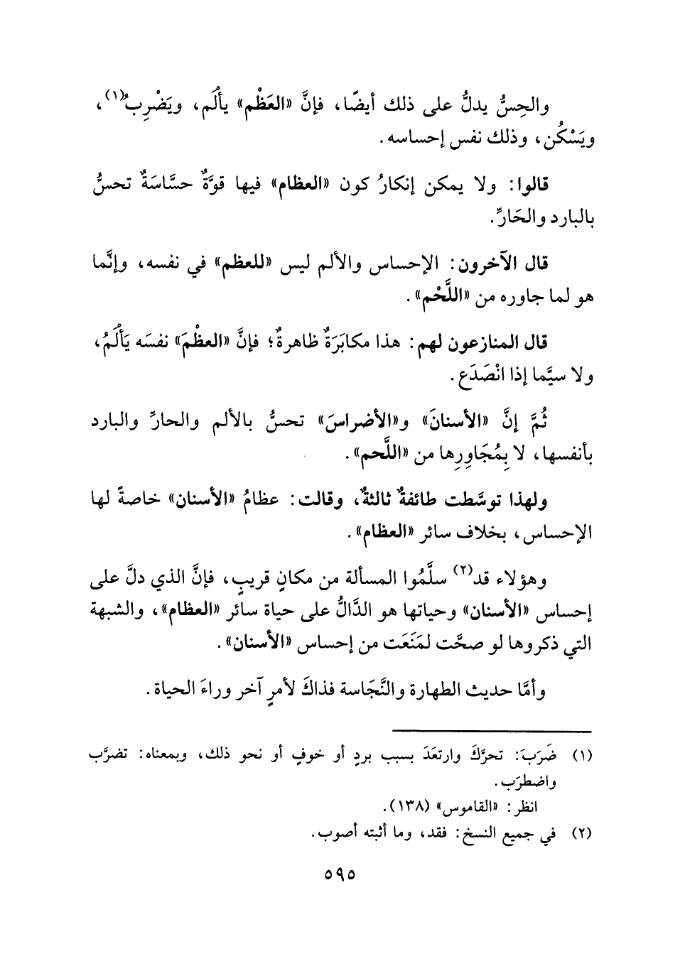 قال الآخرون: الإحساس والألم ليس "للعظم" في نفسه، وإنَّما هو لما جاوره من "اللَّحْم".