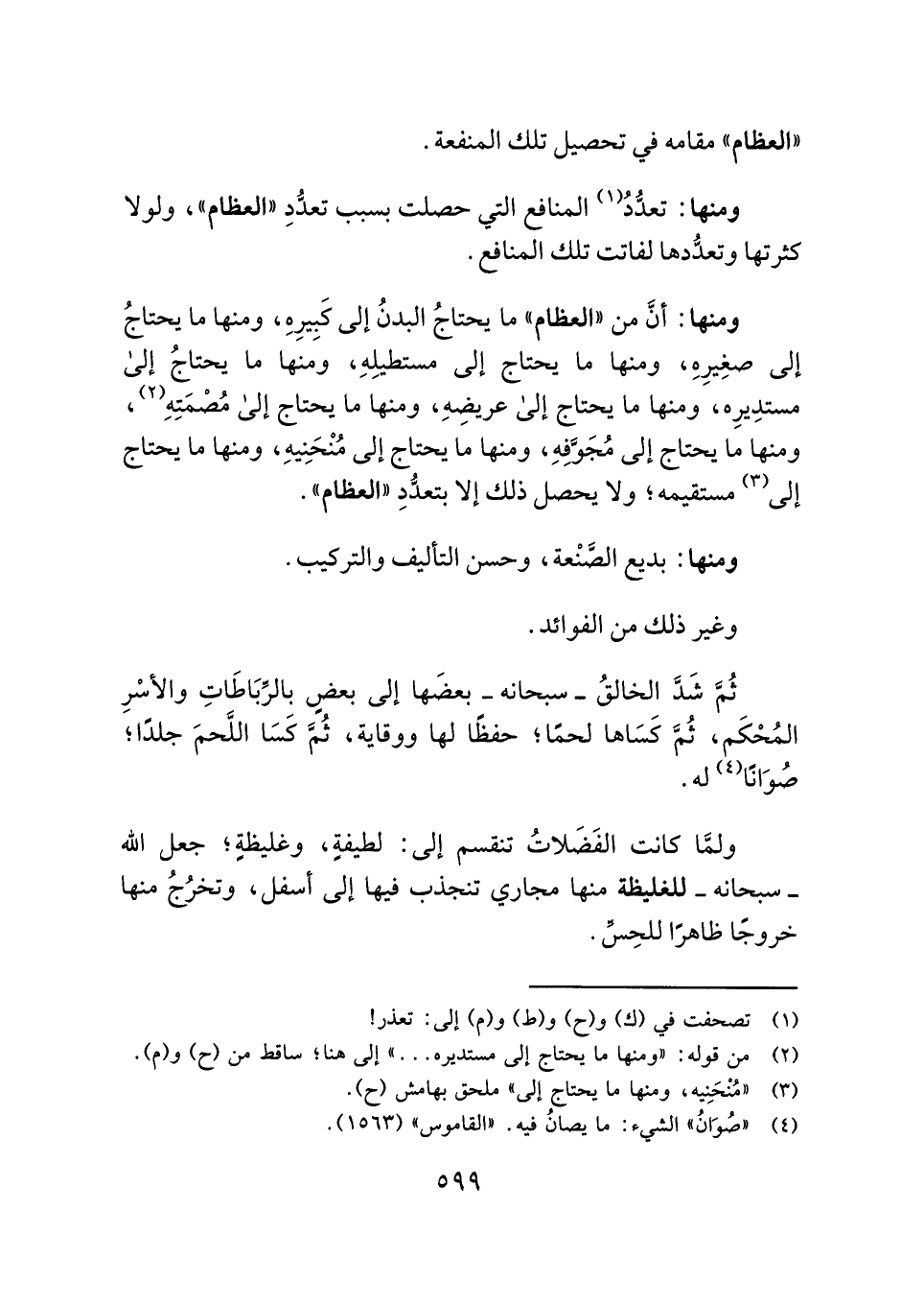 ومنها: أنَّ من "العظام" ما يحتاجُ البدنُ إلى كَبيرِهِ، ومنها ما يحتاجُ إلى صغِيرِهِ، ومنها ما يحتاج إلى مستطيلِهِ، ومنها ما يحتاجُ إلى مستدِيرِه، ومنها ما يحتاج إلى عريضِهِ، ومنها ما يحتاج إلى مُصْمَتِهِ (¬٢) ، ومنها ما يحتاج إلى مُجَوَّفِهِ، ومنها ما يحتاج إلى مُنْحَنِيهِ، ومنها ما يحتاج إلى (¬٣) مستقيمه؛ ولا يحصل ذلك إلا بتعدُّدِ "العظام".