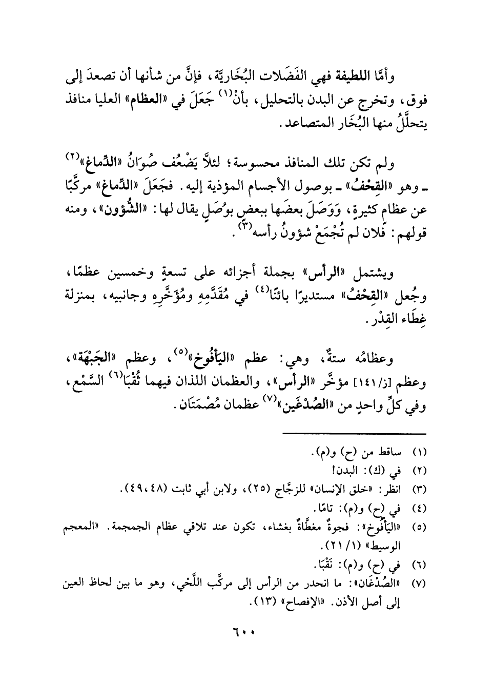 ولم تكن تلك المنافذ محسوسة، لئلَّا يَضْعُف صُوَانُ "الدِّماغ" (¬٢) - وهو "القِحْفُ" - بوصول الأجسام المؤذية إليه. فجَعَلَ "الدِّماغ" مركَّبًا عن عظامٍ كثيرةٍ، وَوَصَلَ بعضَها ببعضٍ بوُصَلٍ يقال لها: "الشُّؤون"، ومنه قولهم: فلان لم تُجْمَعْ شؤونُ رأسه (¬٣).