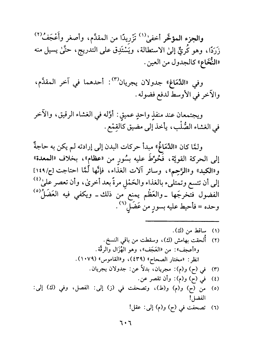 والجزء المؤخَّر أخفى (¬١) تَزْرِيدًا من المقدَّم، وأصغر وأَعْجَفُ (¬٢) زَرَدًا، وهو كُريٌّ إلى الاستطالة، ويَسْتَدِق على التدريج، حتَّى يسيل منه "النُّخَاع" كالجدول من العين.