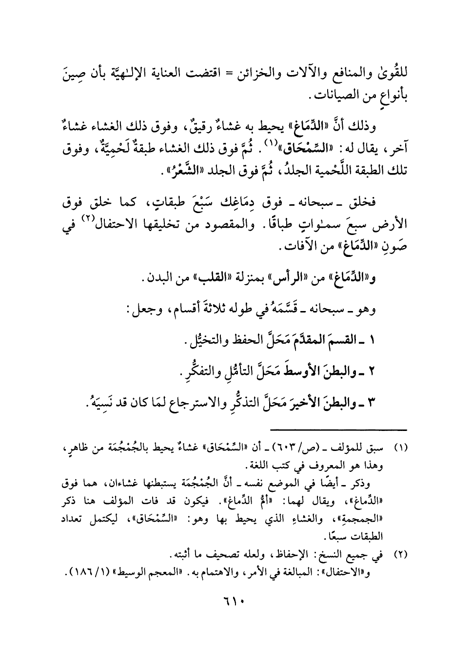 وذلك أنَّ "الدِّمَاغ" يحيط به غشاءٌ رقيقٌ، وفوق ذلك الغشاء غشاءٌ آخر، يقال له: "السِّمْحَاق" (¬١). ثُمَّ فوق ذلك الغشاء طبقةٌ لَحْمِيَّةٌ، وفوق تلك الطبقة اللَّحْمية الجلدُ، ثُمَّ فوق الجلد "الشَّعْرُ".