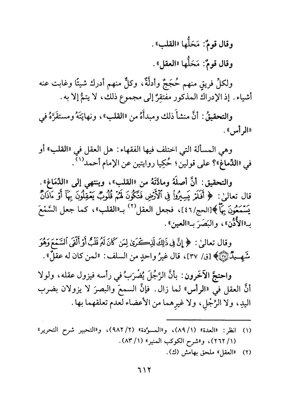 والتحقيق: أنَّ أصلَهُ ومادَّتَهُ من "القلب"، وينتهي إلى "الدِّمَاغ". قال تعالى: {أَفَلَمْ يَسِيرُوا فِي الْأَرْضِ فَتَكُونَ لَهُمْ قُلُوبٌ يَعْقِلُونَ بِهَا أَوْ آذَانٌ يَسْمَعُونَ بِهَا} [الحج: ٤٦]، فجعل العقل (¬٢) بـ "القلب"، كما جعل السَّمْعَ بـ "الأُذُن"، والبَصَرَ بـ "العين".