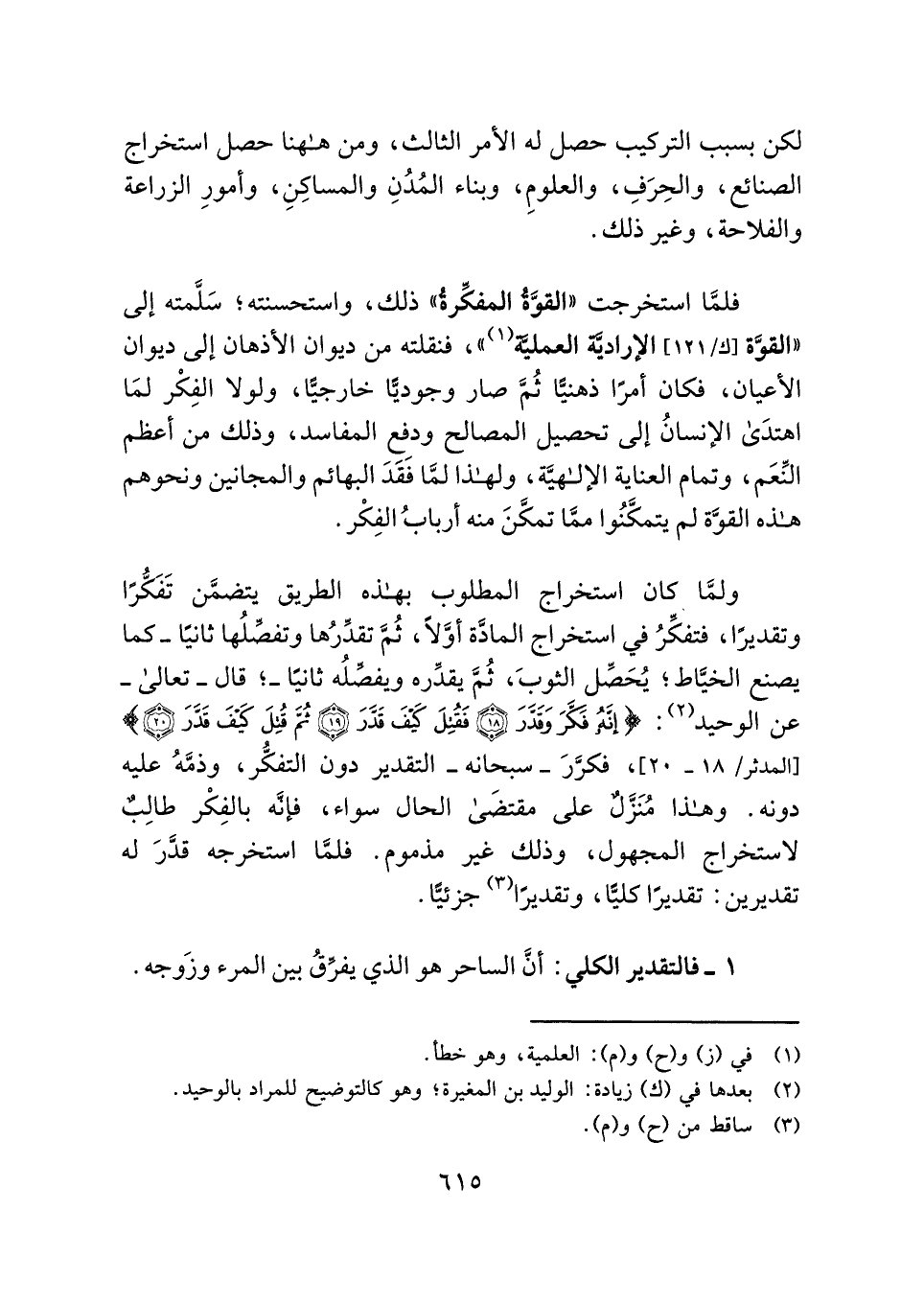 ولمَّا كان استخراج المطلوب بهذه الطريق يتضمَّن تَفَكُّرًا وتقديرًا، فتفكِّرُ في استخراج المادَّة أوَّلًا، ثُمَّ تقدِّرُها وتفصِّلُها ثانيًا - كما يصنع الخيَّاط؛ يُحَصِّل الثوبَ، ثُمَّ يقدِّره ويفصِّلُه ثانيًا -؛ قال - تعالى - عن الوحيد (¬٢): {إِنَّهُ فَكَّرَ وَقَدَّرَ (١٨) فَقُتِلَ كَيْفَ قَدَّرَ (١٩) ثُمَّ قُتِلَ كَيْفَ قَدَّرَ (٢٠)} [المدثر: ١٨ - ٢٠]، فكرَّرَ - سبحانه - التقدير دون التفكُّر، وذمَّهُ عليه دونه. وهذا مُنَزَّلٌ على مقتضَى الحال سواء، فإنَّه بالفِكْر طالِبٌ لاستخراج المجهول، وذلك غير مذموم. فلمَّا استخرجه قدَّرَ له تقديرين: تقديرًا كليًّا، وتقديرًا (¬٣) جزئيًّا.